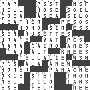 ACROSS 1. Infant food 4. Inconspicuous attention getter 8. Science/research agcy. 11. Land elevation 13. Stockings 14. Land 15. The content of cognition 16. At sea 17. Grain storage tower 18. Cordwainer's material 21. Mexican monetary units 22. Like (prefix) 23. Title for a knight 25. Curvy letter 26. Elected rep. 29. French bagpipes 32. A salt of uric acid 34. Large container 35. Personal Computers (abbr.) 38. Grandmother 39. Capital of Egypt 41. Ancient Greek god of war 43. The 19th letter of the Greek alphabet 44. The first octave above the treble staff 45. Leg joints 46. Copy Pinocchio 50. Compass dir. 51. Personal Computers (abbr.) 54. Chicken ___ king 55. Afresh 57. Baseball hit which scores a run 59. Flamboyance 63. Migrant worker of the '30s 64. Proofreading order 67. Son of Odin 68. 1994 drama film starring Jodie Foster 69. _ and Stitch 70. Scottish caps 71. Compass dir. 72. Sharp bark 73. Portuguese money of account (variant) DOWN 1. Silvers or Donahue 2. Helper 3. Entreaty 4. N Egypt peninsula 5. Distress signal 6. Compass dir. 7. Afternoon social gathering 8. Annoying sound 9. Grain storage towers 10. Soft thread for cleaning between teeth 12. Thin strip of wood or metal 14. Compass dir. 19. Dwelling 20. Australian flightless bird 21. Before (prefix) 23. Play the lead 24. "Tell ____ the Marines!" 26. Player for Phoenix 27. Part of Q.E.F. 28. Grandmother 30. Webber/Rice musical 31. Connect, as a bridge 33. Drawn tight 36. Group working together 37. Observes 39. Give a ring to 40. Silent film actress Nazimova 42. Compass dir. 45. Peachy ____! 47. Ewer handle 48. Portable computer 49. _ tizzy (2 wds.) 51. Give a jingle 52. Popular sodas 53. Grin 56. Electrical Unit 58. Snakelike fish 60. Burn to charcoal 61. Residence 62. Celtic language 64. Insidious 65. Make a knot 66. Pipe bend