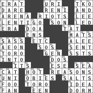 ACROSS 1. Part of Q.E.F. 5. RI univ. 8. Ring climax 11. Have the gumption 12. Painter Guido (1575-1642) 14. Also 15. Sports stadium 17. Disturbances 18. Area sheltered from the wind 19. Small, flat, pigmented spot on the skin 21. Boy, to dad 22. Directed 23. Period 24. ___ good deed 25. Make lace 27. Followers of ems 28. Floor coverings 31. Backtalk 35. And so on (abbr.) 37. Toward shelter 38. A really long time 39. Mayday 41. Transmitted 42. "Corrida" creature 43. Commissioned mil. rank 45. Fast planes 46. To the inside or interior of 47. Two (Sp.) 49. ___ a Wonderful Life 51. Compass dir. 52. Ocean 55. Feline 57. Being at a high temperature 60. Thinks logically 62. Single; one (prefix) 63. Off-Broadway awards 65. Table seasonings 66. Egg _ yung 67. "Corrida" creature 68. It may be bright or harebrained 69. Air blower 70. Car or cant ending 71. Dormintory (informal) DOWN 1. Peak District village in England 2. Less widely known 3. Sports stadium 4. Portable shelter 5. RI univ. 6. Vintage cars 7. To the inside or interior of 8. Baron Munchausen's specialties 9. Leg joint 10. Wrote a lyric poem 13. Is not 16. Helper 17. Exposes to great heat 20. Went 26. Collect or gather 29. Portable shelter 30. Arranges properly for use 31. Suttee (variant) 32. Age 33. Casting lots 34. Snout, nose 36. Gear tooth 40. Spring feasts 44. Olfactory organ 48. Oceans 50. Went for two points 52. Twentieth part of a lira 53. Keyboard key 54. Indian state 55. _ links 56. Small Philippine buffalo 58. Mitch Miller's instrument 59. Become fatigued 61. Stated 64. A really long time