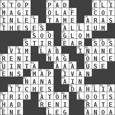 ACROSS 1. Discontinue 5. Groovy apt. 8. Connecticut Ivy Leaguer 11. Wise men 12. Norwegian king 14. Small bed 15. An arm off of a larger body of water 17. Docile 18. Caspian sea tributary 19. College papers 21. Plant genus of onion and garlic 23. "Barney Miller" actor Jack 25. Seize upon or latch onto something 26. Commotion 27. Hearing organ 28. Mayday 31. Zeal 33. Experiment locale 35. Empty; void 37. Painter Guido (1575-1642) 38. Tired old horse 40. At one time in the past 41. National forest in Provo, Utah 43. Auto club (abbr.) 45. Purpose 46. Followers of ems 47. Atlas unit 50. _ the terrible 52. Nanny 53. The 18th letter of the Arabic alphabet 54. Irritating cutaneous sensations 56. A pale violet or amethyst color 61. Musical group of three 62. Smallest unit of an element 65. Plunders 66. Possessed 67. Painter Guido (1575-1642) 68. Assign a rank or rating to 69. Compass dir. 70. Part of a journey 71. Small Philippine buffalo DOWN 1. Stricken, poetically 2. Hyperbolic tangent 3. Stare 4. Sliced desserts 5. Plant holder 6. In the manner of 7. Break 8. Shade of tan 9. Rich soil 10. It is 13. Man or boy (slang) 16. Trial 18. Direct toward a target or goal 20. The visible part of the earth's surface 22. Australian parrot (variant) 24. Northwest Algerian city 26. Stricken, poetically 28. Without 29. Single time 30. Perceive with the eye 31. Distinctive style or manner 32. Taverns 34. Sound made by sheep 36. Part of speech 37. Regret 39. Greek goddess of the earth (variant) 42. Nanny 44. Enthusiastic 48. Approach 49. Soft color 51. Of or related to the anus 52. Non-commissioned officer (abbr.) 54. SW Asia republic 55. Event that recurs at intervals 57. Israeli folk dance 58. Grant temporary use of 59. "Tell ____ the Marines!" 60. Toward the sea 61. Definite Article 63. Single 64. Russian fighter aircraft