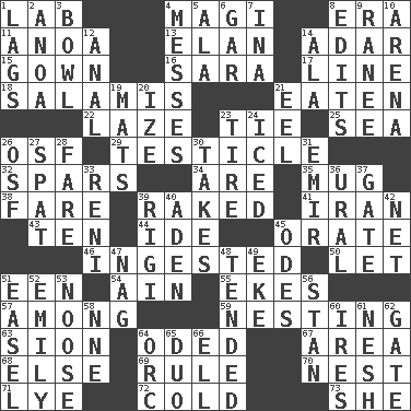 ACROSS 1. Experiment locale 4. Wise men 8. Epoch 11. Small Philippine buffalo 13. Liveliness 14. The sixth month of the Jewish calendar 15. Woman's formal wear 16. "Two Mules for Sister ____" 17. Actor's bit 18. Deli grouping 21. Consumed 22. Goldbrick 23. Standoff 25. Ocean 26. Order of Saint Francis (abbr.) 29. One of the two male reproductive glands 32. Practice fights 34. "We ___ not amused" (Victoria) 35. Java container 38. Conductor's collection 39. Moved through 41. SW Asia republic 43. "___ Little Indians" 44. Binary compound 45. Declaim 46. Consumed 50. Allow 51. Car or cant ending 54. The 18th letter of the Arabic alphabet 55. Supplements with great effort 57. Amid 59. Snuggling 63. The Jewish people; Israel 64. Wrote a lyric poem 67. Length times width 68. Otherwise 69. Court order 70. A home for chicks 71. Sodium hydroxide 72. Lacking warmth 73. A female animal or person DOWN 1. Fails to keep up a pace 2. Small Philippine buffalo 3. Soup holder 4. Makes clutter 5. Insect wing 6. Slender fish 7. _ tizzy (2 wds.) 8. Prepares for publication 9. The wife of a rajah (variant) 10. Sports stadium 12. Of or related to the anus 14. Insect wing 19. Floor coverings 20. Ending with capital 21. Snakelike fish 23. Become fatigued 24. On the rocks 26. Order of Saint Francis (abbr.) 27. Petty quarrel 28. Conductor's collection 30. Proceeds 31. Independent ruler or chieftain 33. Painter Guido (1575-1642) 36. Mountain range 37. Yard entry 39. Swiss mountan, "Queen of the Mountains" 40. An important port of Yemen 42. Fish or hair follower 45. Lyric poems 47. Tired old horse 48. Watched over 49. Make supply last 51. Artist's stand 52. Poet Dickinson 53. Trap for birds or small mammals 56. Comedian Laurel of Laurel & Hardy 58. Compass dir. 60. Angers 61. Tender 62. Yard entry 64. The grampus (Milton) 65. Superhero pair 66. Pipe bend