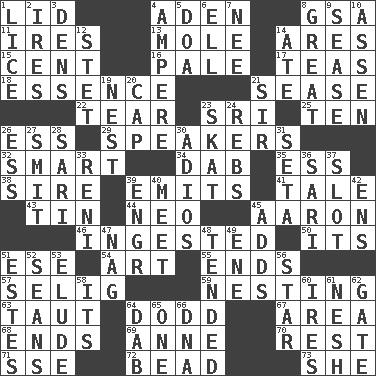 ACROSS 1. Flaplike covering 4. An important port of Yemen 8. Girls' org. (abbr.) 11. Angers 13. Undercover agent 14. Ancient Greek god of war 15. Penny 16. Diluted with white 17. Beverages made from leaves 18. Gist 21. Gospel singer Marvin 22. Separate forcefully 23. _ Lanka 25. "___ Little Indians" 26. Curvy letter 29. Orators 32. Don Adams' spy role 34. Pat or tap gently 35. Double-curved letter 38. Father 39. Gives off 41. Falsehood 43. Metal container 44. Modern: prefix 45. Composer Copland 46. Consumed 50. ___ a Wonderful Life 51. Compass dir. 54. Tate display 55. Conclusions 57. Former Milwaukee Brewers owner Bud 59. Inhabiting a nest 63. Drawn tight 64. Texas town _ City 67. Type of rug 68. Extremities 69. Queen of England 1702-14 70. Relief 71. Compass dir. 72. Necklace unit 73. A female animal or person DOWN 1. Louse (plural) 2. Angers 3. Lairs 4. Electrical Unit 5. ___ good deed 6. Pipe bend 7. Born 8. Relatively large 9. Gospel singer Marvin 10. NE Netherlands city 12. Proofreading order 14. Had dinner 19. Egg locale 20. Head covering 21. Title for a knight 23. Three-handed card game 24. Confederate soldiers (slang) 26. Curvy letter 27. Stricken, poetically 28. Indian skirt 30. Goodbye (Sp.) 31. Stalk of a moss capsule 33. Painter Guido (1575-1642) 36. Indian skirt 37. Slit 39. Engineer (abbr.) 40. Rendezvous 42. Followers of ems 45. Does sums 47. Tired old horse 48. Looked after 49. Compass dir. 51. _____ Park, CO 52. Actors Connery and Penn 53. Evade 56. Play the lead 58. It is 60. Angers 61. Tender 62. Yard entry 64. Pat or tap gently 65. Single 66. Heredity factor (abbr.)