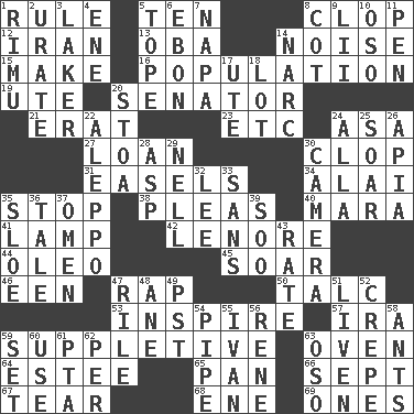 ACROSS 1. Governing power 5. "___ Little Indians" 8. Hoof sound 12. SW Asia republic 13. Chief or king in Benin or Nigeria 14. Annoying sound 15. Cause to be 16. Census information 19. Shoshoni 20. Elected representative 21. Part of Q.E.F. 23. And so on (abbr.) 24. White ___ sheet 27. Grant temporary use of 30. Hoof sound 31. Artist's stands 34. Jai _ 35. Discontinue 38. Entreaties 40. Hindu Mythology: god of death 41. Desk light 42. Poe poem 44. Margarine 45. Fly high 46. Car or cant ending 47. Reproach for some lapse or misdeed 50. Baby powder 53. Stimulate to action 57. Lyricist Gershwin 59. Supplementary 63. Baking chamber 64. First name in cosmetics 65. Baking dish 66. Back-to-school mo. 67. Rend 68. Compass dir. 69. Singles DOWN 1. Tall New Zealand timber tree 2. A salt of uric acid 3. Member of a famous L.A. basketball team 4. Compass dir. 5. Drink excessively 6. Inky black, to poets 7. California wine valley 8. Small bed 9. Cards in a Roman deck? 10. Bear (Spanish) 11. Animal enclosure 14. Drug cop 17. Shoshoni 18. Car dealer's back yard 20. Portico 22. City in Syria 24. Silent film actress Nazimova 25. Fly high 26. Capital of Western Samoa 28. Cleo's killer 29. 1994 drama film starring Jodie Foster 30. Device for capturing images 32. Area sheltered from the wind 33. Without 35. A type of plum 36. Lie 37. Sign of something about to happen 39. "Barney Miller" actor Jack 43. Pace 47. Cause heat under the collar 48. A saturated hydrocarbon 49. Pacific Standard Time (abbr.) 51. Make or become more lively 52. Streamer paper 54. Corncob 55. _ the terrible 56. French philosopher Descartes 58. Pismires 59. Arrange properly for use 60. Purpose 61. Parent Teacher Association (abbr.) 62. For each 63. Bear (Spanish)
