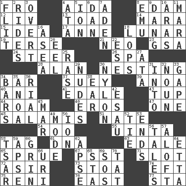 ACROSS 1. From 4. Opera by Verdi 8. Dutch treat 12. 54 in ancient Rome 13. Frog relative 14. Hindu Mythology: god of death 15. The content of cognition 17. Queen of England 1702-14 18. Type of eclipse 19. Laconic 21. Modern: prefix 23. Girls' org. (abbr.) 24. Navigate 26. Health resort 28. Actor Alda or Thicke 30. Snuggling 34. Long, evenly shaped piece 37. Chop _ 39. Small Philippine buffalo 40. Cuckoo 41. Peak District village in England 43. Uncastrated adult male sheep 44. Wander aimlessly 46. Greek god of love 47. Single 48. Deli grouping 51. Nathan's nickname 54. Friend of Pooh 55. National forest in Provo, Utah 58. Label 61. Heredity factor (abbr.) 63. Peak District village in England 65. Disorder 67. Inconspicuous attention getter 71. Notch 72. SW Saudi Arabia district 73. Portico 74. Lizard (obsolete) 75. Painter Guido (1575-1642) 76. 90 degrees 77. R.R. building DOWN 1. Secret move to avoid paying debts 2. Amusement-park features 3. Unconcealed 4. "One Day ___ Time" 5. Electrically charged atom 6. One of the 12 tribes of Israel 7. An important port of Yemen 8. Australian flightless bird 9. Mild oath, euphamism for damn 10. Caspian sea tributary 11. Hindu Mythology: god of death 16. Toward the sea 18. Chops off 20. Snakelike fish 22. Compass dir. 25. Raze (variant) 27. "One Day ___ Time" 29. Unclothed pictures 30. High-strength synthetic material 31. To the inside or interior of 32. Part of speech 33. Yawn 34. Soap units 35. Small Philippine buffalo 36. Monetary unit of Yemen 38. Ewer handle 42. He sold his birthright 45. Third mo. 49. Method 50. Electrically charged atom 52. Standoff 53. Extremities 56. Lies 57. High up in or into the air 58. Russian ruler of old 59. Domed church section 60. Smile widely 62. Domed church section 64. Singer James 66. RI univ. 68. R.R. building 69. Distress signal 70. Make lace