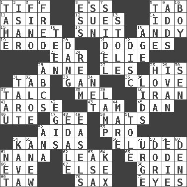 ACROSS 1. Small quarrel 5. Double-curved letter 8. Keyboard key 11. SW Saudi Arabia district 12. Takes to court 14. Wedding promise 15. French painter Edouard 17. In a ____ (agitated or irritated) 18. "60 Minutes" Commentator Rooney 19. Eaten away 21. Evades 23. Hearing organ 25. Writer Wiesel 26. Queen of England 1702-14 27. French article 28. Part of HMS, perhaps 31. Bar bill 33. Separate the seeds from cotton 35. Garlic unit 37. Baby powder 38. Cartoonist voice _ Blanc 40. SW Asia republic 41. Came up 43. Scottish cap 45. Daniel's nick name 46. Shoshoni 47. Turn to the right 50. Floor protectors 52. Opera by Verdi 53. Adept person 54. Sunflower state 56. Evaded 61. Grandmother 62. Path through which fluid escapes 65. Eat (away) 66. Night before a holiday 67. Otherwise 68. Smile widely 69. The 23rd letter of the Hebrew alphabet 70. Saxophone 71. Snake ____ (dice throw) DOWN 1. Docile 2. Astrian river, tributary to the Danube 3. A pale, very dry sherry 4. Flintstone 5. Curvy letter 6. Player for Phoenix 7. A glass for beer 8. Prong on a fork 9. Does sums 10. Male child 13. Took without asking 16. Adolescent 18. Personal question 20. Mild oath, euphamism for damn 22. Plate 24. 480, 500 or 516 sheets of paper 26. Lettered men learn these first 28. Israeli folk dance 29. "Terrible" tsar 30. Elected rep. 31. Small pie 32. _ vera 34. Fish or hair follower 36. Flaplike coverings 37. The 19th letter of the Greek alphabet 39. Desk light 42. The front part of a cuirass 44. Female horse 48. Peak District village in England 49. Artist's stands 51. Lacquered or enameled metalware 52. Santa ___, CA 54. Polynesian shrub of the pepper family 55. Afresh 57. Goad 58. Small, narrow, flatbottom fishing boat 59. Singer Brickell 60. Hiding places for outlaws 61. Fish or hair follower 63. White ___ sheet 64. A weed