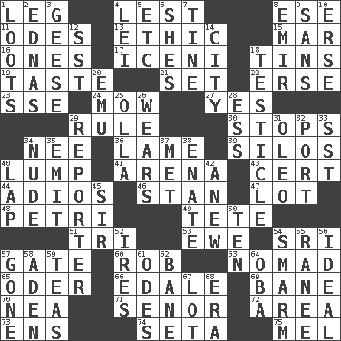 ACROSS 1. Part of a journey 4. For fear that 8. Compass dir. 11. Lyric poems 13. Principle of right and wrong 15. Third mo. 16. Singles 17. Ancient Celtic tribe of eastern Britain 18. Metal containers 19. Clothes sense 21. Put into a specified state 22. Celtic language 23. Compass dir. 24. Cut the grass 27. It is so 29. General guideline 30. Halts 34. Born 36. Unable to walk 39. Grain storage towers 40. Mass 41. Sports stadium 43. Foregone conclusion 44. Goodbye (Sp.) 46. Comedian Laurel of Laurel & Hardy 47. Car dealer's back yard 48. _ dish (used to culture cells) 49. False hair 51. Three (prefix) 53. She-sheep 54. _ Lanka 57. Yard entry 60. Director Reiner 63. Roamer 65. River in Europe 66. Peak District village in England 69. Object of repulsion 70. Teachers' org. 71. Sir (Sp.) 72. Length times width 73. Followers of ems 74. Stalk of a moss capsule 75. Cartoonist voice _ Blanc DOWN 1. Plunders 2. Ferber et al. 3. Honkers 4. Luau accessory 5. And so on (abbr.) 6. "______ My Girl" (Turtles hit) 7. Prong on a fork 8. Independent ruler or chieftain 9. Without 10. Celtic language 12. Fast jet (abbr.) 14. Municipality 18. A testis 20. Australian flightless bird 25. Water jar 26. Puts on (as clothing) 28. Curvy letter 29. News announcer 31. Butter sub 32. Left side of a ship or aircraft 33. Fast jet (abbr.) 34. Naked 35. Send forth 37. Was introduced to 38. Related on the mother's side 40. Infant locale 42. Afresh 45. Title for a knight 50. "___ Little Indians" 52. Angers 54. Excessive but superficial compliments 55. Indian princess (variant) 56. Perfect 57. Went 58. Arabian gulf 59. Afternoon social gatherings 61. Lyric poems 62. Object of repulsion 64. Chief or king in Benin or Nigeria 67. Car dealer's back yard 68. Period