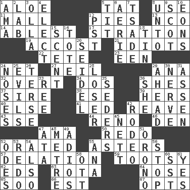 ACROSS 1. Medicinal plant 5. Make lace 8. Purpose 11. Promenade 12. Sliced desserts 13. Non-commissioned officer (abbr.) 14. Most capable 17. Ski resort town in Vermont 19. Buttonhole 21. Foolish or stupid persons 22. False hair 23. Car or cant ending 24. Fish or hair follower 27. Famous astronaut Armstrong 29. Santa ___, CA 32. Unconcealed 34. Two (Sp.) 36. "______ My Girl" (Turtles hit) 37. Beget 38. Compass dir. 39. Possessive pronoun 40. Otherwise 41. Directed 42. Rob, plunder, or pillage 43. Compass dir. 44. Former U.S. Attorney General Janet 46. Lair 47. Nanny (var.) 50. Do over again 52. Declaimed 55. Michaelmas daisies 57. Accusation by an informer 59. A girl or young woman (variant) 62. Begley and Asner 63. Roll call or roster of names 64. Olfactory organ 65. "Barney Miller" actor Jack 66. Eastern Standard Time (abbr.) 67. Chooses DOWN 1. Wet nurse (var.) 2. Experiment locale 3. Water jar 4. Voters do this 5. Teat (slang) 6. Nest on high 7. Sadhe (variant) 8. To (old English) 9. Highlander 10. Immeasurably long periods of time 12. Pacific Standard Time (abbr.) 15. Odor 16. Carryall 18. Metal container 20. A glass for beer 24. Olfactory organs 25. Vices 26. Laconic 28. Failure 29. Forward in time 30. Impudent aggressiveness 31. NE Netherlands city 33. To riddle 35. Spring feasts 36. A female animal or person 42. Cowboy competition 45. Remaining after all deductions 47. _ moment's notice (2 wds.) 48. Distance measurement (Brit.) 49. Goodbye (Sp.) 51. U. of Maine site 52. Lyric poems 53. Make new 54. In addition 55. Santa ___, CA 56. Halt 58. Baseball player Mel 60. Fast jet (abbr.) 61. It is so