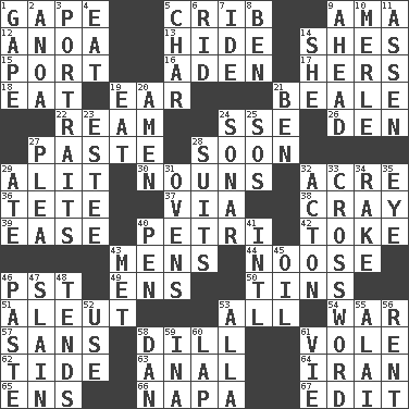 ACROSS 1. Yawn 5. Baby bed with high sides 9. Nursemaid (var.) 12. Small Philippine buffalo 13. Flintstone garb 14. "______ My Girl" (Turtles hit) 15. Sweet dark-red dessert wine 16. An important port of Yemen 17. Possessive pronoun 18. Consume 19. Ewer handle 21. Calif. Air Force Base 22. 480, 500 or 516 sheets of paper 24. Compass dir. 26. Lair 27. Thick mixture 28. Within a short period 29. Came down and settled, as after flight 30. Parts of speech 32. 1/640 square mile 36. Wig 37. By way of 38. Supercomputer manufacturer 39. Relaxation 40. _ dish (used to culture cells) 42. Puff or smoke 43. Not women's 44. Trap for birds or small mammals 46. Pacific Standard Time (abbr.) 49. Followers of ems 50. Canisters 51. Native American of Southwest Alaska 53. 100% 54. Armed conflict 57. Without 58. Deli pickle 61. Short-tailed, large-bodied rat 62. Event that recurs at intervals 63. Of or related to the anus 64. SW Asia republic 65. Followers of ems 66. California wine valley 67. Prepare for publication DOWN 1. Yawn 2. Small Philippine buffalo 3. Likenesses of persons 4. Consume 5. Burn to charcoal 6. To free from 7. Binary compound 8. Benjamin's nick name 9. Having the leading position 10. Haggard of country music 11. NE Netherlands city 14. A female animal or person 19. Consume 20. So be it 21. Benjamin's nick name 23. First name in cosmetics 24. Underwater navigation system 25. Distress signal 27. Entreaty 28. Sets or collections 29. Had dinner 31. Baking chambers 32. 13-14th century defensive garment 33. What you're doing now 34. Immoral or dissolute person 35. Sight organ 40. Fenced enclosure 41. International (abbr.) 43. Was introduced to 45. Lubricate 46. Thick mixture 47. Killed 48. Looks after 52. Purpose 53. Silent film actress Nazimova 55. Jai _ 56. Monthly bill 58. Daniel's nick name 59. _ tizzy (2 wds.) 60. Pet locale 61. Compete