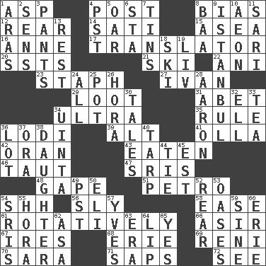 ACROSS 1. Viper 4. Mail 8. Prejudice 12. Located in or toward the back 14. Suttee (variant) 15. Toward the sea 16. Queen of England 1702-14 17. Interpreter 20. Fast planes 21. What Jean-Claude Killy likes to do 22. Black tropical American cuckoo 23. Staphylococcus 27. _ the terrible 29. Plunder 31. Collude with 34. Extreme 35. General guideline 36. Farming town in central California 39. The first octave above the treble staff 41. Water jar 42. Northwest Algerian city 43. Consumed 46. Strained 47. Indian titles of respect 48. Yawn 51. Stone: prefix 54. Quiet! 56. Wily 58. Relaxation 61. Rotating or pertaining to rotation 66. SW Saudi Arabia district 67. Angers 68. 4th largest of the Great Lakes 69. Painter Guido (1575-1642) 70. "Two Mules for Sister ____" 71. Plant excrements 72. Observe DOWN 1. Caspian sea tributary 2. Elected reps. 3. Leg coverings 4. Pacific Standard Time (abbr.) 5. Boat paddle 6. R.R. building 7. Canisters 8. Sound made by sheep 9. Byzantium, centuries later 10. A really long time 11. Indian skirt 13. Respite 18. What Jean-Claude Killy likes to do 19. 54 in ancient Rome 24. Everything 25. Plant holder 26. Israeli folk dance 28. Composer Copland 30. Falsehoods 32. Pipe bend 33. Beverage made from leaves 34. National forest in Provo, Utah 36. Car dealer's back yard 37. Mouth or opening 38. Female offspring 40. Canvas cover 44. Neckwear 45. Eastern Standard Time (abbr.) 49. Pacific Standard Time (abbr.) 50. Biblical high priest 52. Bring up, as a child 53. Fertile tracts in a desert 54. Indian titles of respect 55. Israeli folk dance 57. Jacques Cousteau's middle name 59. Trig term 60. 4th largest of the Great Lakes 62. White ___ sheet 63. Epoch 64. Mouth edge 65. It is so