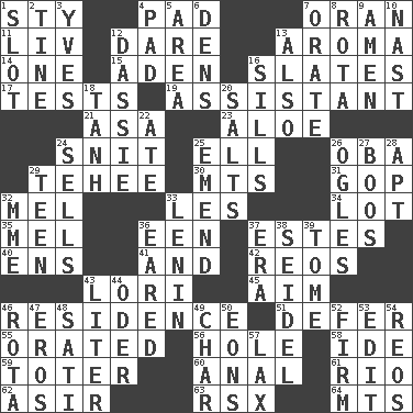 ACROSS 1. Filthy place 4. Groovy apt. 7. NW Algerian seaport 11. 54 in ancient Rome 12. Have the gumption 13. Odor 14. Single 15. Arabian gulf 16. Chalkboards 17. Trials 19. Helper 21. White ___ sheet 23. _ vera 24. In a ____ (agitated or irritated) 25. Pipe bend 26. Chief or king in Benin or Nigeria 29. Giggle 30. Mountains (abbr.) 31. Republican Party 32. Cartoonist voice _ Blanc 33. French article 34. Car dealer's back yard 35. Cartoonist voice _ Blanc 36. Car or cant ending 37. _____ Park, CO 40. Followers of ems 41. Plus 42. Vintage cars 43. Australian parrot (variant) 45. Direct toward a target or goal 46. Dwelling 51. Put off 55. Spoke pompously 56. Opening into or through something 58. Binary compound 59. Carrier 60. Of or related to the anus 61. _ de Janeiro 62. SW Saudi Arabia district 63. Acura sports coupe 64. Mountains (abbr.) DOWN 1. Position in a hierarchy or organization 2. Prong on a fork 3. Jacques Cousteau's middle name 4. Writing tablet 5. Length times width 6. Habitations of wild animals 7. Speak pompously 8. Roll call or roster of names 9. So be it 10. Political cartoonist Thomas 12. Small ungulate mammals of Africa 13. In addition 16. Beverly of Met fame 18. Hyperbolic tangent 20. Table seasonings 22. Had dinner 24. Makes a sale 25. Make improvements or corrections to 26. Stares 27. Expressions of contempt or scorn 28. Fitting 29. Adolescent 32. Madame (abbr.) 33. Soviet premier 1918-24 36. Having ears or earlike features 37. Epoch 38. Beer mug 39. Heavy book 43. 61 cubic inches 44. Baltic tributary 46. Roll call or roster of names 47. Greek god of love 48. Suttee (variant) 49. Burn to charcoal 50. Immeasurably long periods of time 52. Securely fixed in place 53. Prepare for publication 54. Vintage cars 57. Not strict
