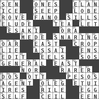 ACROSS 1. Elected rep. 4. Washington bills 8. Enthusiasm 12. Frozen water 13. Ooze 14. Ear part 15. Be footloose 17. Papal veil 18. Beverly of Met fame 19. Dodge 21. Afternoon social gathering 23. Allow 24. 1973 Nobel Price Winner (Physics) Leo 26. Mouth or opening 28. Ancient Persian 30. Catching in a trap 34. Rowing implement 37. Compass direction 39. Riding implement 40. Untruth 41. Slender Brazilian palm 43. Followers of ems 44. Prepare for publication 46. Snakelike fish 47. Distress signal 48. Commissioned military rank 51. Compass direction 54. And not 55. Less widely known 58. Two (Sp.) 61. Baseball player Mel 63. Mexican monetary units 65. Rep 67. Cassini of fashion 71. Needle case 72. Angers 73. Cause heat under the collar 74. Oval reproductive body of a fowl 75. Itself 76. To provide with a ceiling 77. Car or cant ending DOWN 1. The founder of a family 2. Learning spot: Fr. 3. Mole, birthmark 4. Order of Saint Francis (abbr.) 5. Teachers' org. 6. Car or cant ending 7. Specific locale 8. Connecticut Ivy Leaguer 9. Hang loosely or laxly 10. Competent 11. Egg locale 16. Dutch treat 18. "Two Mules for Sister ____" 20. Make supply last 22. Age 25. It may be bright or harebrained 27. Curve 29. Artist's stand 30. Lacking originality or spontaneity 31. Angers 32. Words to Nanette 33. Global Positioning Systems (abbr.) 34. Cassini of fashion 35. Assistant 36. It's straight from the horse's mouth 38. Compass dir. 42. Astrian river, tributary to the Danube 45. Nine, plus one 49. Carrot, for example 50. Nonscientific branch of learning 52. Plant excrement 53. Woody plant 56. First name in cosmetics 57. Makeup applied to the cheeks 58. Raised platform 59. Legendary monster 60. Stitch closed the eyes of (a falcon) 62. Torque (variant) 64. Public display of a written message 66. Science/research agcy. 68. Untruth 69. Biblical high priest 70. Set