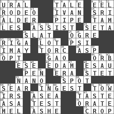 ACROSS 1. Mountain range 5. Falsehood 9. Snakelike fish 12. Cowboy competition 14. "Terrible" tsar 15. _ Lanka 16. Tree or shrub in the Birch family 17. Corncob 18. Scottish cap 19. French article 20. Help 23. Stalk of a moss capsule 24. Narrow board 25. Legendary monster 27. Port city in Latvia 30. Car dealer's back yard 32. Air pressure measure (abbr.) 33. "If ____ say so..." 34. Torque (variant) 36. Cleo's killer 38. Choose 39. E Mali city 40. Globe 43. Compass dir. 46. Dutch treat 48. Son of Isaac 49. Writing instrument 51. Epoch 52. Proofreading order 53. Billionth: prefix 54. Blemish 56. Scorch 58. Eat 61. Pull behind 64. Big collection agency 65. At sea 66. Clothes sense 68. White ___ sheet 69. Trial 70. Speak pompously 71. Cartoonist voice _ Blanc 72. American tennis player Robert 73. Riding implement DOWN 1. Mountain range 2. Hero or heavy, e.g. 3. Does sums 4. Area sheltered from the wind 5. Native american tent (variation) 6. Deliberation 7. Portable computer 8. Compass dir. 9. First name in cosmetics 10. Part of Q.E.F. 11. Pale green bean 13. Of the mouth 21. Table seasoning 22. Moe Howard, for one 23. Indian titles of respect 24. Declare 26. Girls' org. (abbr.) 27. _ de Janeiro 28. Naughty child 29. Yard entry 31. Buy and sell 35. Rough 37. Mail 41. Actress Charlotte 42. With the exception that 44. Coast Guard woman 45. Car or cant ending 47. Atlas contents 48. Eastern Standard Time (abbr.) 50. Annoying sounds 53. Rhinal 55. Von Bismarck 56. Thailand, formerly 57. Celtic language 59. Tender 60. Yard entry 61. Russian ruler of old 62. Von Bismarck 63. Shed a tear 65. _ moment's notice (2 wds.) 67. Curve