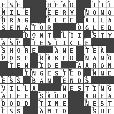 ACROSS 1. Compass dir. 4. Froth on beer 8. Teat (slang) 11. Mediterranean tributary 13. Suggestive of the supernatural 14. Words to Nanette 15. To trail on the ground 16. Toward shelter 17. Silent film actress Nazimova 18. Legislator 21. Stared at amorously 22. Do not 23. Cards in a Roman deck? 25. Filthy place 26. Viper 29. One of the two male reproductive glands 32. Dinah or Pauly 34. One (Scot) 35. Afternoon social gathering 38. Airs 39. Swept the length of 41. Billionth: prefix 43. Nine, plus one 44. Binary compound 45. Composer Copland 46. Consumed 50. Compass dir. 51. Double-curved letter 54. Bar 55. Extremities 57. Country estate 59. Nestling 63. Toward shelter 64. Saudi Arabian king (1953-1964) 67. Type of rug 68. Texas town _ City 69. Prong on a fork 70. A home for chicks 71. Double-curved letter 72. Among 73. A female animal or person DOWN 1. Conclusions 2. Father 3. Style 4. Centers 5. Snakelike fish 6. "We ___ not amused" (Victoria) 7. Color 8. For Whom the Bell _____ 9. An arm off of a larger body of water 10. Sycophant 12. Mild oath 14. Tired old horse 19. Carry 20. Single 21. Petroleum 23. Actor's bit 24. On the rocks 26. Cleo's killer 27. Guess 28. Introduce or present, as a question 30. Proceeds 31. Inactive volcano in Sicily 33. Painter Guido (1575-1642) 36. Merit 37. At once, immediately (arch.) 39. Capital of Latvia 40. An important port of Yemen 42. Single 45. Does sums 47. Basketball assoc. 48. Watched over 49. Compass dir. 51. Elude 52. Grain storage towers 53. Bobsleighs 56. Comedian Laurel of Laurel & Hardy 58. Directed 60. Angers 61. Tender 62. Yard entry 64. R.R. building 65. Direct toward a target or goal 66. Single; one (prefix)