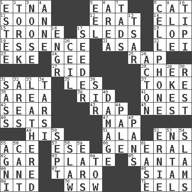 ACROSS 1. Inactive volcano in Sicily 5. Ingest 8. Domesticated feline 11. Within a short period 12. Part of Q.E.F. 14. Biblical high priest 15. Marketplace scale 17. Bobsleighs 18. Trim (branches) 19. Gist 21. White ___ sheet 22. Luau accessory 23. Supplement with great effort 24. Unit of force equal to gravity 25. Strike 27. To free from 28. "Mermaids" star 31. Table seasoning 35. French article 37. Puff or smoke 38. Length times width 39. To free from 41. Washington bills 42. Scorch 43. Strike 45. Egg locale 46. Fast planes 47. Atlas unit 49. Part of HMS, perhaps 51. Chicken ___ king 52. Followers of ems 55. Adept person 57. Compass dir. 60. Commissioned military rank 62. Slender fish 63. Food holder 65. Before Barbara or Clara 66. Compass dir. 67. Pacific island yam 68. Thailand, formerly 69. It would 70. Compass dir. 71. Snakelike fish DOWN 1. First name in cosmetics 2. Cod relative 3. Trap for birds or small mammals 4. Singer Murray 5. Snakelike fish 6. Type of rug 7. Small boys 8. Portable communications device 9. _ vera 10. Native american tent (variation) 13. Russian ruler of old 16. Engineer (abbr.) 17. Sowing specialist 20. To provide with a ceiling 26. Gambison 29. Makes supply last 30. Remainder 31. Backtalk 32. Ancient Greek god of war 33. Resembling or made to resemble leather 34. Tarsus (plural) 36. Title for a knight 40. Break 44. Diluted with white 48. Baking dishes 50. Back-to-school mo. 52. Bert's buddy 53. Brizilian seaport 54. Hits or strikes with great force 55. Hindu god of fire 56. Patter 58. Cole _ (cabbage dish) 59. Hearing organs 61. Relaxation 64. Pull behind