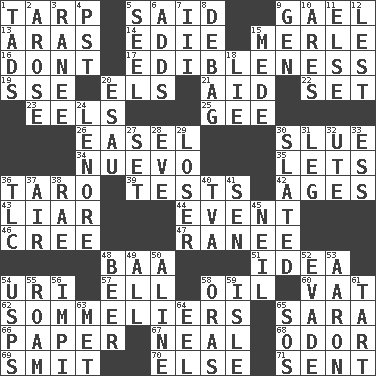 ACROSS 1. Canvas cover 5. Alleged 9. Highlander 13. Ancient river in northeast Turkey 14. Singer Brickell 15. Haggard of country music 16. Do not 17. The property of being fit to eat 19. Compass dir. 20. Raised railways 21. Assist 22. Put into a specified state 23. Snakelike fish 25. Turn to the right 26. Artist's stand 30. Turn sharply 34. New (sp.) 35. Allows 36. Edible starchy tuberous root 39. Trials 42. Eras 43. One who doesn't tell the truth 44. Incident 46. Algonquian 47. The wife of a rajah (variant) 48. Sound made by sheep 51. It may be bright or harebrained 54. RI univ. 57. Pipe bend 58. Petroleum 60. Large container 62. Wine waiters 65. "Two Mules for Sister ____" 66. Some stationery 67. Actress Patricia 68. Scent 69. Stricken, poetically 70. Otherwise 71. Emitted DOWN 1. Bits 2. Came up 3. Indian princess (variant) 4. Pacific Standard Time (abbr.) 5. Stitch closed the eyes of (a falcon) 6. Sums up 7. One more than two 8. Debunk (Brit. slang) 9. Commissioned military rank (abbr.) 10. Ancient Greek god of war 11. Otherwise 12. For fear that 15. Ancient Persian 18. Falsehood 20. Son of Isaac 24. Poe poem 27. Arrange properly for use 28. Night before a holiday 29. Failure 30. Scheduled 31. Part of a journey 32. Shoshoni 33. Curvy letter 36. Affectionate concern, for short 37. Atmosphere 38. Actress Charlotte 40. Federal power corp. 41. Elected rep. 45. Famous astronaut Armstrong 48. Fermented drink made from hops 49. 100% 50. Place in a line 52. Dodge 53. Composer Copland 54. United States Postal Service (abbr.) 55. Wander 56. Body of Kaffir warriors 58. Mouths or openings 59. Small island 61. Small pie 63. Was introduced to 64. Snakelike fish 65. Mayday