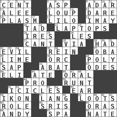 ACROSS 1. Penny 5. Viper 8. The sixth month of the Jewish calendar 12. Toward shelter 13. Central Nebraska county 15. Have the gumption 16. Suffix with ecto or cyto 18. _ and Stitch 19. "If ____ say so..." 20. Small amount or degree 22. Portable computers 24. Angers 26. French article 27. Patter 28. By way of 29. Possessed 32. Morally bad or wrong 35. It's straight from the horse's mouth 37. Chief or king in Benin or Nigeria 38. Welles in "The Third Man" 39. The grampus (Milton) 40. More than one (prefix) 41. Plant excrement 42. Blind as ____ 43. Lyric poems 44. Connecticut Ivy Leaguer 45. Had dinner 46. Taken by mouth 49. Adept person 50. The smallest animal of a litter 51. Winter's stalactites 55. Hearing organ 56. Image 57. Austrian-born American filmmaker Fritz 59. Plunders 63. Hero or heavy, e.g. 64. Indian titles of respect 65. Mouths or openings 66. Actor Griffith 67. Health resort 68. Nathan's nickname DOWN 1. Head covering 2. Pipe bend 3. Teachers' org. 4. One of the two male reproductive glands 5. Everything 6. Land 7. Monetary unit of Botswana 8. Goodbye (Sp.) 9. Moist 10. Ancient river in northeast Turkey 11. Marina Del _, California 14. Cotton for raincoats, e.g. 17. Hindu Mythology: god of death 21. Lair 23. Beverage made from leaves 25. Disco prop 28. Winning man's name 29. Parka part 30. Competent 31. 24-hour periods 32. Otherwise 33. Small bottle 34. Body of Kaffir warriors 36. Period 40. Characterized by complete cowardliness 42. Ringlike coral islands and reefs 45. Curve 47. Sorrow 48. Of or related to the anus 49. Abounding in pines 51. Visual representation of an object 52. Lacking warmth 53. Hearing organs 54. Clip 56. Retirement account (abbr.) 58. Girls' org. (abbr.) 60. Mouth or opening 61. Make lace 62. Compass dir.
