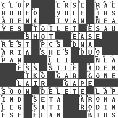 ACROSS 1. Hoof sound 5. Celtic language 9. Actress Charlotte 12. Cowboy competition 14. Grand slam 15. Big collection agency 16. Sports stadium 17. _ the terrible 18. Teachers' org. 19. Consenting reply 20. Bathroom plumbing fixture 23. He sold his birthright 24. Opportunity 25. Relaxation 27. State of inaction 30. Personal Computers (abbr.) 32. Heredity factor (abbr.) 33. Roberta Peters solo 34. "______ My Girl" (Turtles hit) 36. Superhero pair 38. Baking dish 39. Biblical high priest 40. Teachers' org. 43. Curvy letter 46. Filth; sediment 48. Arabian gulf 49. Ring climax 51. Slender fish 52. Went 53. Den 54. Yawn 56. Within a short period 58. Keyboard key 61. Pet locale 64. Working for oneself (abbr.) 65. Bristle 66. Scent 68. Part of a journey 69. Suttee (variant) 70. "The Thinker" sculptor 71. Compass dir. 72. Enthusiasm 73. Auction offers DOWN 1. Supercomputer manufacturer 2. Old wives' tales, e.g. 3. Lyric poems 4. Animal enclosure 5. Tending to cause great harm 6. Be footloose 7. Scheduled 8. Car or cant ending 9. Wash lightly 10. Length times width 11. Son of Isaac 13. Pledge 21. I made a mistake 22. Strong, restless desires 23. He sold his birthright 24. R.R. building 26. Plus 27. Reproach for some lapse or misdeed 28. Period 29. Trig term 31. Major League Baseball Commissioner Bud 35. Fodder prepared in a silo 37. Southwest Nigerian state 41. Car or cant ending 42. One (Scot) 44. Comedian Laurel of Laurel & Hardy 45. What Jean-Claude Killy likes to do 47. Part of Q.E.F. 48. Mature 50. Severe or trying experience 53. Cabin 55. Lightbulb-shaped fruit 56. Filth; sediment 57. Washington bills 59. Singer James 60. (Had) reclined 61. Farming town in central California 62. Among 63. Baking dishes 65. Compass dir. 67. Director Reiner