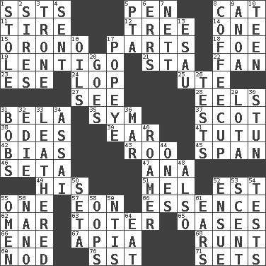 ACROSS 1. Fast planes 5. Animal enclosure 8. Domesticated feline 11. Hoop that covers a wheel 12. Woody plant 14. Single 15. U. of Maine site 17. Actors' quests 18. Enemy 19. Small, flat, pigmented spot on the skin 21. R.R. building 22. Air blower 23. Compass dir. 24. Chop off 25. Shoshoni 27. Observe 28. Snakelike fish 31. Actor Lugosi 35. Symbol (abbr.) 37. Highlander 38. Lyric poems 39. Ewer handle 41. Ballerina skirt 42. Prejudice 43. Friend of Pooh 45. Connect, as a bridge 46. Stalk of a moss capsule 47. Santa ___, CA 49. Part of HMS, perhaps 51. Cartoonist voice _ Blanc 52. Eastern Standard Time (abbr.) 55. Single 57. Period of immesurable duration 60. Center 62. Third mo. 63. Carrier 65. Fertile tracts in a desert 66. Compass dir. 67. Capital of Western Samoa 68. The smallest animal of a litter 69. Lower and raise head in agreement 70. Fast jet (abbr.) 71. Puts into a specified state DOWN 1. Fur scarf 2. Founders of families 3. Heavy duty weighing machine 4. Transmitted 5. Parent Teacher Assoc. 6. Blunders 7. Remaining after all deductions 8. Java holder (2 wds.) 9. Small Philippine buffalo 10. Adolescent 13. Son of Isaac 16. Petroleums 17. Wimpy's pal 20. Moves 26. Trials 29. Globular water bottle used in Asia 30. Astound 31. Moves up and down 32. Singer Brickell 33. Tough but pliablecoriaceous 34. Slender Brazilian palm 36. Spoil 40. Nomad 44. Washington bills 48. In addition 50. Bristle 52. Take place subsequently 53. Odor 54. Trials 55. Presage 56. Billionth: prefix 58. I made a mistake 59. Nuclear Threat Initiatives 61. Hearing organs 64. Erode