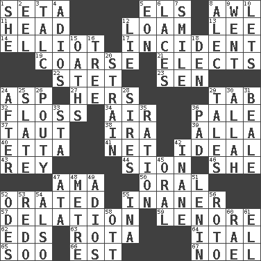 ACROSS 1. Stalk of a moss capsule 5. Raised railways 8. Leather borer 11. Froth on beer 12. Rich soil 13. Area sheltered from the wind 14. American author Paul (1891-1958) 17. Event 19. Rough 21. Opts 22. Proofreading order 23. Elected rep. 24. Cleo's killer 27. Possessive pronoun 29. Bar bill 32. Soft thread for cleaning between teeth 34. Wind 36. Light colored 37. Strained 38. Lyricist Gershwin 39. Silent film actress Nazimova 40. Singer James 41. Fish or hair follower 42. Perfect 43. Marina Del _, California 44. The Jewish people; Israel 46. A female animal or person 47. Nanny (var.) 50. Spoken 52. Spoke pompously 55. More empty; more void 57. Accusation by an informer 59. Poe poem 62. Begley and Asner 63. Roll call or roster of names 64. Slanted text style (abbr.) 65. "Barney Miller" actor Jack 66. Eastern Standard Time (abbr.) 67. Christmas carol DOWN 1. A female animal or person 2. Snakelike fish 3. Baby powder 4. Goodbye (Sp.) 5. Age 6. Shoestrings 7. Grin 8. Actor Baldwin 9. Gone 10. Allows 12. Whopper 15. Profane or obscene expressions 16. Family _ (genealogy) 18. Lair 20. Put through a sieve 24. Following 25. Chalkboard 26. Marked by pouting 28. Fathers 29. Stories 30. Assad's deity 31. Memphis, Tenn. Street 33. R.R. building 35. Food allowance for one day 36. Groovy apt. 42. Silly 45. Taken by mouth 47. "One Day ___ Time" 48. Distance measurement (Brit.) 49. Goodbye (Sp.) 51. Soviet premier 1918-24 52. Lyric poems 53. Make new 54. In addition 55. _ tizzy (2 wds.) 56. Printing process, for short 58. Baseball player Mel 60. Actress Charlotte 61. Pipe bend