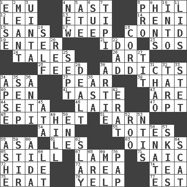 ACROSS 1. Australian flightless bird 4. Political cartoonist Thomas 8. Silvers or Donahue 12. Flowery wreath 13. Needle case 14. Painter Guido (1575-1642) 15. Without 17. Shed a tear 18. Continued (abbr.) 19. Keyboard key 21. Wedding promise 23. Distress signal 24. Lies 26. Nonscientific branch of learning 28. Nourish 30. Inveterate users 34. White ___ sheet 37. Lightbulb-shaped fruit 39. Not this but _ 40. Writing instrument 41. Clothes sense 43. "We ___ not amused" (Victoria) 44. Bristle 46. Den 47. Choose 48. Curse 51. Merit 54. The 18th letter of the Arabic alphabet 55. Hauls 58. White ___ sheet 61. French article 63. Pig sounds 65. Free of sound 67. Desk light 71. Ketch in the Levant 72. Flintstone garb 73. Length times width 74. Beverage made from leaves 75. Part of Q.E.F. 76. Sharp bark 77. Eastern Standard Time (abbr.) DOWN 1. Otherwise 2. Intended 3. National forest in Provo, Utah 4. ___ Haven, CT 5. Had dinner 6. Institute legal proceedings 7. Native american tent (variation) 8. Adept person 9. Coop moms 10. To the inside or interior of 11. Flaplike coverings 16. Automatically 18. Drawstring 20. To riddle 22. Male parent 25. Back-to-school mo. 27. Teat (slang) 29. Started a card game 30. Nick name for Arthur 31. US Secretary of Labor Elaine L. _ 32. Canvas cover 33. Proofreading order 34. Domed church section 35. Ooze 36. Opposed to 38. White ___ sheet 42. Part of Q.E.F. 45. _ moment's notice (2 wds.) 49. Land elevation 50. Compass dir. 52. Friend of Pooh 53. Nuclear Threat Initiatives 56. Related on the mother's side 57. Atmospheres 58. American tennis player Robert 59. Commotion 60. Opera by Verdi 62. Kill 64. Go away! 66. Allow 68. "We ___ not amused" (Victoria) 69. Cartoonist voice _ Blanc 70. Infant food