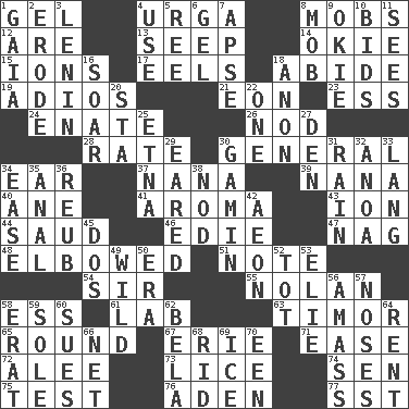 ACROSS 1. Set 4. Capital and largest city of Mongolia 8. Crowds into 12. "We ___ not amused" (Victoria) 13. Ooze 14. Migrant worker of the '30s 15. Charged atoms 17. Snakelike fish 18. Tolerate 19. Goodbye (Sp.) 21. Age 23. Double-curved letter 24. Related on the mother's side 26. Lower and raise head in agreement 28. Assign a rank or rating to 30. Commissioned military rank 34. Ewer handle 37. Grandmother 39. Grandmother 40. A saturated hydrocarbon 41. Odor 43. Electrically charged atom 44. Saudi Arabian king (1953-1964) 46. Singer Brickell 47. Tired old horse 48. Shoved, as through a crowd 51. Short letter 54. Title for a knight 55. Pitcher Ryan 58. Double-curved letter 61. Experiment locale 63. Southeast Indonesia island 65. One shot 67. One of the Great Lakes 71. Relaxation 72. Toward shelter 73. Louse (plural) 74. Elected rep. 75. Trial 76. An important port of Yemen 77. Fast jet (abbr.) DOWN 1. Greek goddess of the earth (variant) 2. Wear away 3. Soviet premier 1918-24 4. Purpose 5. To riddle 6. Set 7. Domed church section 8. Crowd into 9. Migrant worker of the '30s 10. Auction offers 11. Perceives with the eye 16. Fly high 18. Soon (poet.) 20. R.R. building 22. Single 25. Inactive volcano in Sicily 27. Lair 29. Having ears or earlike features 30. Street urchin 31. Precipitation 32. Small Philippine buffalo 33. Long (Scottish) 34. Relaxation 35. Of or related to the anus 36. Reuben's nickname 38. Allow head to fall sleepily 42. Age 45. Two (Sp.) 49. Uncontrolled 50. Period 52. Small child 53. Writer Wiesel 56. Collect or gather 57. Olfactory organs 58. Part of Q.E.F. 59. Not divided or shared with others 60. Institutes legal proceedings 62. Actor Lugosi 64. Monthly bill 66. Fish or hair follower 68. To free from 69. Frozen water 70. Car or cant ending