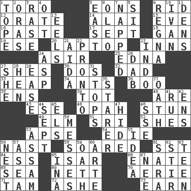 ACROSS 1. "Corrida" creature 5. Immeasurably long periods of time 9. To free from 12. Declaim 14. Jai _ 15. First lady 16. Thick mixture 17. Back-to-school mo. 18. Separate the seeds from cotton 19. Compass dir. 20. Portable computer 23. Restaurants 24. SW Saudi Arabia district 25. Pulitzer Prize-winning author Ferber 27. "______ My Girl" (Turtles hit) 30. Two (Sp.) 32. Male parent 33. Pile 34. Pismires 36. Surprise greeting 38. Followers of ems 39. Small child 40. "We ___ not amused" (Victoria) 43. Compass dir. 46. Brightly colored fish 48. Make senseless or dizzy 49. Shade tree 51. Indian title of respect (Mr.) 52. "______ My Girl" (Turtles hit) 53. Domed church section 54. Singer Brickell 56. Political cartoonist Thomas 58. Flew 61. Fast jet (abbr.) 64. Curvy letter 65. Astrian river, tributary to the Danube 66. Related on the mother's side 68. Ocean 69. Remaining after all deductions 70. Nest on high 71. Scottish cap 72. American tennis player Robert 73. Merit DOWN 1. Drink excessively 2. Mouths or openings 3. To erase 4. Baseball player Mel 5. Compass direction 6. Butter sub 7. Slept 8. Be seated 9. Canadian anthropologist Darnell 10. "Terrible" tsar 11. Cub Scout units 13. Snakelike fish 21. Opera by Verdi 22. Right away 23. Southeast Asian peninsula 24. Viper 26. Small moist lump or mass 27. A female animal or person 28. Layer 29. Comfort 31. Discontinues 35. A viewer who gazes fixedly 37. Pledge 41. Sorrow 42. Followers of ems 44. Back-to-school mo. 45. Raised railways 47. Flintstone garb 48. Compass dir. 50. Makes clutter 53. Indian state 55. The content of cognition 56. Egg locale 57. Toward the sea 59. Pledge 60. Johnson of "Laugh-In" 61. "Two Mules for Sister ____" 62. Tumult 63. Adolescent 65. _ tizzy (2 wds.) 67. Born