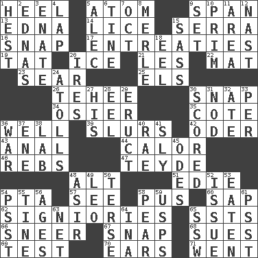 ACROSS 1. The bottom of a shoe or boot 5. Tiny particle 9. Connect, as a bridge 13. Pulitzer Prize-winning author Ferber 14. Louse (plural) 15. Spanish missionary in California 16. Fastener 17. Pleas 19. Make lace 20. Frozen water 21. French article 22. Floor covering 23. Dry up 25. Raised railways 26. Giggle 30. Fastener 34. Flexible twig of a willow tree 35. ____ d'Azur (French Riviera) 36. Not ill 39. Disparaging remarks 42. River in Europe 43. Of or related to the anus 44. Bodily heat indicating an inflammation 46. Confederate soldiers (slang) 47. Miss Universe 1986, Barbara Palacios _ 48. The first octave above the treble staff 51. Singer Brickell 54. Parent Teacher Assoc. 57. Observe 58. Suppuration 60. Plant excrement 62. Seigniories (variant) 65. Fast planes 66. Contemptuous expression 67. Fastener 68. Takes to court 69. Trial 70. Hearing organs 71. Left DOWN 1. Behest 2. Ferber et al. 3. Related on the mother's side 4. Pet locale 5. Actor Baldwin 6. Prong on a fork 7. Sep. follower 8. Haggard of country music 9. Put into a specified state 10. Demure 11. Length times width 12. Political cartoonist Thomas 15. Backtalk 18. Snakelike fish 20. Angers 24. Ringlike coral islands and reefs 27. Part of HMS, perhaps 28. Snakelike fish 29. Spew [out] 30. Tallied 31. Dreamland 32. Had dinner 33. For each 36. Armed conflict 37. Compass dir. 38. Experiment locale 40. Actress Charlotte 41. Insidious 45. Lyric poems 48. SW Saudi Arabia district 49. Lion 50. Laconic 52. Come out of 53. Consumed 54. Inconspicuous attention getter 55. Prong on a fork 56. Eons 58. Lightbulb-shaped fruit 59. United States Postal Service (abbr.) 61. Inconspicuous attention getter 63. Fish or hair follower 64. _ tizzy (2 wds.) 65. Compass dir.