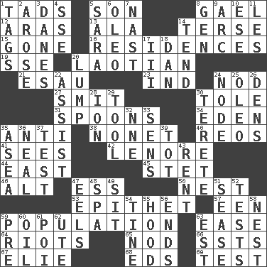 ACROSS 1. Small amounts or degrees 5. Male child 8. Highlander 12. Caspian sea tributary 13. Chicken ___ king 14. Laconic 15. Went 16. Dwellings 19. Compass dir. 20. Of or relating to Laos or its people 21. Son of Isaac 23. Working for oneself (abbr.) 24. Lower and raise head in agreement 27. Stricken, poetically 30. Lacquered or enameled metalware 31. Soup utensils 34. Locale of original sin 35. Against 38. Music written for nine 40. Vintage cars 41. Observes 42. Poe poem 44. Compass direction 45. Proofreading order 46. The first octave above the treble staff 47. Double-curved letter 50. Egg locale 53. Curse 57. Car or cant ending 59. Census information 63. Relaxation 64. Disturbances 65. Lower and raise head in agreement 66. Fast planes 67. Writer Wiesel 68. Begley and Asner 69. Trial DOWN 1. Labels 2. Came up 3. Natives or inhabitants of Denmark 4. Compass dir. 5. "Two Mules for Sister ____" 6. Butter sub 7. Political cartoonist Thomas 8. Commissioned military rank (abbr.) 9. Curve 10. Compass dir. 11. French article 14. Look after 17. One more than two 18. One of the 12 tribes of Israel 20. Mass 22. Aid 24. Connecting point 25. Margarine 26. Habitations of wild animals 28. Electrically charged atom 29. Utensil 30. Cigar-shaped 32. Compass dir. 33. Elected reps. 35. Toward the sea 36. Anneal 37. Trial 39. Small child 43. Monthly bill 47. Snakelike fish 48. Health resort 49. Be seated 51. Gospel singer Marvin 52. Trials 54. Prong on a fork 55. Parka part 56. Extremities 58. Egg locale 59. Before (prefix) 60. Petroleum 61. Luau course 62. Shoshoni 63. Eastern Standard Time (abbr.)
