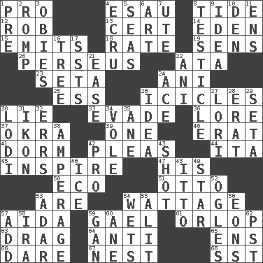 ACROSS 1. Adept person 4. Son of Isaac 8. Event that recurs at intervals 12. Director Reiner 13. An absolute certainty 14. Paradise 15. Gives off 18. Pace 19. Elected reps. 20. Son of Zeus who helped slay Medusa 22. "One Day ___ Time" 23. Stalk of a moss capsule 24. Black tropical American cuckoo 25. Curvy letter 26. Winter's stalactites 30. Whopper 33. Dodge 36. Old wives' tales, e.g. 37. Gumbo ingredient 39. Single 40. Part of Q.E.F. 41. Dormintory (informal) 42. Entreaties 44. Call ___ day 45. Stimulate to action 47. Part of HMS, perhaps 50. Environmental prefix 51. Von Bismarck 53. "We ___ not amused" (Victoria) 54. Electrical Measurement 57. Opera by Verdi 59. Highlander 61. Fourth or lowest deck 63. To trail on the ground 64. Against 65. Followers of ems 66. Have the gumption 67. A home for chicks 68. Fast jet (abbr.) DOWN 1. Before (prefix) 2. Play 3. Off-Broadway awards 4. Shade of tan 5. Oceans 6. Tate display 7. Shoshoni 8. One of the two male reproductive glands 9. It may be bright or harebrained 10. Lair 11. Followers of ems 16. Relationship diagram 17. Fast planes 21. Relaxation 22. Black tropical American cuckoo 24. Adept person 26. The main thing one is thinking about 27. Australian parrot (variant) 28. Part of Q.E.F. 29. Bristle 30. Farming town in central California 31. Visual representation of an object 32. Blunders 34. Short-tailed, large-bodied rat 35. One (Scot) 38. Electrical Measurement 42. Adept person 43. Opportunity 46. Frozen water 48. "Tell ____ the Marines!" 49. Play the lead 52. Stares 53. The sixth month of the Jewish calendar 54. Moistens 55. Came down and settled, as after flight 56. Immeasurably long periods of time 57. Increase 58. Retirement account (abbr.) 59. Separate the seeds from cotton 60. One (Scot) 62. Pacific Standard Time (abbr.)