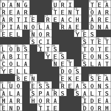 ACROSS 1. Mild oath, euphamism for damn 5. RI univ. 8. Beverage made from leaves 11. Stern 12. Portable shelter 14. Rowing implement 15. Nick name for Arthur 17. Arrive at 18. "We ___ not amused" (Victoria) 19. Player piano 21. Actress Charlotte 22. Heredity factor (abbr.) 23. Snakelike fish 24. Not either 25. Affirmative reply 27. _-fi 28. Proofreading order 31. Tennis shots 35. It is 37. Haul 38. "This won't hurt ____!" 39. Affirmative reply 41. Immeasurably long periods of time 42. Root beer relative 43. Fish or hair follower 45. Narrow board 46. Shout 47. Two (Sp.) 49. Benjamin's nick name 51. Supplement with great effort 52. Ocean 55. Nilotic language 57. Curvy letter 60. Thinks logically 62. Wing 63. Practice fights 65. Table seasonings 66. Impair 67. Israeli folk dance 68. The main thing one is thinking about 69. Conclusion 70. Standoff 71. Dormintory (informal) DOWN 1. Window treatment 2. Nest on high 3. Brizilian seaport 4. Smile widely 5. Shoshoni 6. Bring up, as a child 7. South American Indian 8. Inedible or poisonous agaric 9. Merit 10. Type of rug 13. Those people 16. Immeasurably long periods of time 17. Noteworthy scarcity 20. Venues 26. _____ Park, CO 29. Inactive volcano in Sicily 30. Trial 31. Made of lace 32. Mitch Miller's instrument 33. Big road sign 34. Lacking originality or spontaneity 36. Elected rep. 40. Spring feasts 44. Casino tip 48. Oceans 50. Tender 52. Twentieth part of a lira 53. Keyboard key 54. Indian state 55. Unable to walk 56. ____ Bator, Mongolia 58. Blemish 59. Indian skirt 61. Expressed in words 64. Actress Charlotte