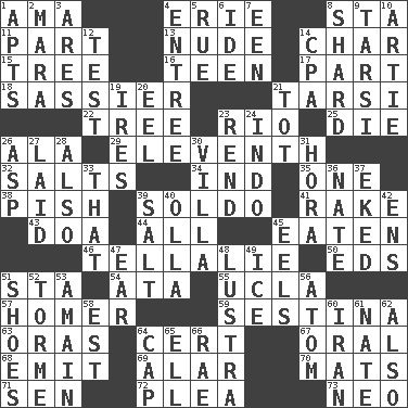 ACROSS 1. Nanny (var.) 4. One of the Great Lakes 8. R.R. building 11. Role in a play 13. Naked 14. Burn to charcoal 15. Relationship diagram 16. Adolescent 17. Piece 18. More lively and spirited 21. Tarsus (plural) 22. Family _ (genealogy) 23. River (Sp.) 25. Expire 26. Wing 29. Veterans Day date 32. Table seasonings 34. Indiana (abbr.) 35. Single 38. Expression of disdain 39. Twentieth part of a lira 41. Libertine 43. ___ good deed 44. 100% 45. Consumed 46. Copy Pinocchio 50. Begley and Asner 51. R.R. building 54. _ moment's notice (2 wds.) 55. Southern CA. univ. 57. Home run 59. French poetic form 63. Mouths or openings 64. Foregone conclusion 67. Of the mouth 68. Send forth 69. Having or resembling wings 70. Floor protectors 71. Elected rep. 72. Entreaty 73. Modern: prefix DOWN 1. Flats, for short 2. Hindu Mythology: god of death 3. Ancient Greek god of war 4. Main course 5. Regret 6. Binary compound 7. Car or cant ending 8. Pottery fragment 9. Tarsus (plural) 10. Nick name for Arthur 12. Trial 14. Numbers guy (abbr.) 19. Angers 20. Snakelike fish 21. Small child 23. Tear apart 24. Southeast Asian peninsula 26. Viper 27. Put down 28. In addition 30. Country residence 31. Israeli folk dance 33. Not this but _ 36. Nathan's nickname 37. Supplemented with great effort 39. Table seasoning 40. Water jar 42. Followers of ems 45. Snakelike fish 47. Ewer handle 48. A period of five years 49. Frozen water 51. Imelda's hoard 52. Singer Mel 53. With great haste 56. Smallest unit of an element 58. Eastern Standard Time (abbr.) 60. SW Asia republic 61. Nathan's nickname 62. In addition 64. Head covering 65. Pipe bend 66. Actress Charlotte