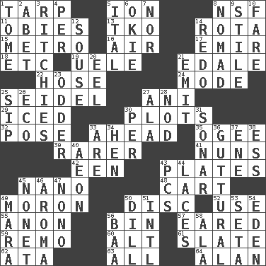 ACROSS 1. Canvas cover 5. Electrically charged atom 8. Science/research agcy. 11. Off-Broadway awards 13. Ring climax 14. Round or rotation of duties 15. Paris' subway 16. Wind 17. Arab leader 18. And so on (abbr.) 19. Ubangi River tributary 21. Peak District village in England 22. Stockings 24. Method 25. A glass for beer 27. Black tropical American cuckoo 29. On the rocks 30. Small pieces of grounds 32. Introduce or present, as a question 33. Toward the future 35. Double curve, resembling the letter S 39. Less widely known 41. Religious women 42. Car or cant ending 43. Food holders 45. Billionth: prefix 48. Heavy open wagon 49. Person of subnormal intelligence 50. Flat circle 52. Purpose 55. Soon (poet.) 56. Storage container 57. Having ears or earlike features 59. San ____ (Riviera town) 60. The first octave above the treble staff 61. Schedule 62. "One Day ___ Time" 63. 100% 64. Actor Alda or Thicke DOWN 1. Heavy book 2. Collude with 3. Actors Guy, Robert Welles, and Clint 4. For each 5. Slanted text style (abbr.) 6. Migrant worker of the '30s 7. Not either 8. Wanderer 9. Vertical member of a panel or frame 10. Conductor's collection 12. Lush 14. Do over again 20. Snakelike fish 21. Send forth 23. More peculiar 25. Small drink 26. Environmental prefix 27. Wing 28. Allow head to fall sleepily 30. For each 31. Echolocation 33. "We ___ not amused" (Victoria) 34. Layer 36. From the throat 37. Compass dir. 38. Double-curved letter 40. A really long time 43. Personal Computers (abbr.) 44. Shoestrings 45. Music written for nine 46. Scent 47. Words to Nanette 49. Hindu Mythology: god of death 50. Deli pickle 51. International (abbr.) 53. Stalk of a moss capsule 54. Genesis locale 56. Sound made by sheep 58. Chicken ___ king