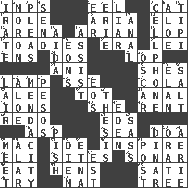 ACROSS 1. Naughty children 5. Snakelike fish 8. Domesticated feline 11. Hero or heavy, e.g. 12. Roberta Peters solo 14. Biblical high priest 15. Sports stadium 17. Believer in; advocate of (suffix) 18. Trim (branches) 19. Sycophants 21. Epoch 22. Luau accessory 23. Followers of ems 24. Two (Sp.) 25. Trim (branches) 27. Black tropical American cuckoo 28. "______ My Girl" (Turtles hit) 31. Desk light 35. Compass dir. 37. Root beer relative 38. Toward shelter 39. Small child 41. Of or related to the anus 42. Charged particles 43. A female animal or person 45. Monthly bill 46. Do over again 47. Begley and Asner 49. Cleo's killer 51. Ocean 52. ___ good deed 55. Big _ 57. Binary compound 60. Heighten or intensify 62. Connecticut Ivy Leaguer 63. Locates 65. Echolocation 66. Consume 67. Coop moms 68. Suttee (variant) 69. Attempt to accomplish something 70. Floor protector 71. Family _ (genealogy) DOWN 1. Feeling or showing extreme anger 2. Person of subnormal intelligence 3. Entreaties 4. Post 5. Hearing organ 6. One of the Great Lakes 7. One who doesn't tell the truth 8. Portable communications device 9. Medicinal plant 10. Native american tent (variation) 13. Of or related to the anus 16. Opera by Verdi 17. Aid 20. Immeasurably long periods of time 26. Motion picture award 29. Style 30. Table seasoning 31. Den 32. Medicinal plant 33. Ananias' fault 34. Mexican monetary units 36. Greek goddess of the dawn 40. College paper 44. Genesis locale 48. Backtalk 50. Expression of disdain 52. Middle Eastern gold or silver currency 53. Speak pompously 54. Nest on high 55. Confront 56. Having or resembling wings 58. South Vietnam president (1954) 59. Inactive volcano in Sicily 61. Mail 64. Eastern Standard Time (abbr.)