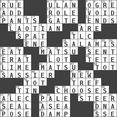 ACROSS 1. Sorrow 4. Uhlan (variant) 8. Legendary monster 12. Find the sum of 13. Hero or heavy, e.g. 14. State of nonexistence 15. Leg coverings 18. Yard entry 19. Extremities 20. Of or relating to Laos or its people 22. "We ___ not amused" (Victoria) 23. Argument over a trivial matter 24. Affectionate concern, for short 25. Compass dir. 26. Deli grouping 30. Ingest 33. Taiwanese island in East China Sea 36. Emitted 37. Part of Q.E.F. 39. Car dealer's back yard 40. False hair 41. Welles in "The Third Man" 42. Taiwanese island in East China Sea 44. Small child 45. More impudent 47. ___ Haven, CT 50. Small child 51. Unclean, religiously 53. Metal container 54. Opts 57. Actor Baldwin 59. Light colored 61. Guide 63. Lick closed 64. At sea 65. Heredity factor (abbr.) 66. Introduce or present, as a question 67. Moist 68. Compass dir. DOWN 1. Hit sharply and swiftly 2. Freehold land 3. Ferber et al. 4. Capital and largest city of Mongolia 5. Grant temporary use of 6. The first octave above the treble staff 7. Born 8. Cloudy 9. Went 10. To free from 11. Begley and Asner 16. Drink excessively 17. Comedian Laurel of Laurel & Hardy 21. A distinct part 22. Everything 24. The 19th letter of the Greek alphabet 26. Fast planes 27. Confront 28. To the inside or interior of 29. Proofreading order 30. Snakelike fish 31. Operatic vocal solo 32. Scottish caps 34. Having or resembling wings 35. Small child 38. A testis 42. Was introduced to 43. To (old English) 46. Electrically charged atom 48. Greek god of love 49. 270 degrees 52. Gives food to 53. Afternoon social gatherings 54. Clement's nick name 55. Pile 56. Elected reps. 57. Cleo's killer 58. Lion 59. Groovy apt. 60. White ___ sheet 62. Actress Charlotte