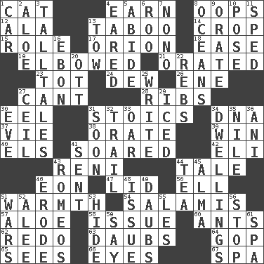 ACROSS 1. Domesticated feline 4. Merit 8. I made a mistake 12. Insect wing 13. Off limits 14. Riding implement 15. Hero or heavy, e.g. 17. Constellation of myth 18. Comfort 19. Shoved, as through a crowd 21. Declaimed 23. Small child 24. Morning condensation 26. Compass dir. 27. Patter 28. Teases 30. Snakelike fish 31. Unemotional ones 34. Heredity factor (abbr.) 37. Compete 38. Speak pompously 39. Victory 40. Raised railways 41. Flew 42. Biblical high priest 43. Painter Guido (1575-1642) 44. Lie 46. A really long time 47. Flaplike covering 50. Pipe bend 51. Heat 54. Deli grouping 57. _ vera 58. Come out of 60. Pismires 62. Redecorate 63. Applies to a surface 64. Republican Party 65. Perceives with the eye 66. Sight organs 67. Health resort DOWN 1. Auto 2. _ vera 3. Baron Munchausen's specialties 4. Having ears or earlike features 5. Tolerate 6. Friend of Pooh 7. Words to Nanette 8. Seas 9. Speak pompously 10. Airs 11. Drove too fast 13. Pull behind 16. Inky black, to poets 20. Baseball player Mel 22. Confederate soldiers (slang) 25. Compose 27. To provide with a ceiling 29. On the rocks 30. Night before a holiday 31. Within a short period 32. Lag or linger behind 33. Rowing implement 34. Residences 35. Mediterranean tributary 36. Cuckoo 41. Posted 43. Lover boys 44. Afternoon social gathering 45. _ mater 46. Eat (away) 48. Come out of 49. Applies to a surface 51. Armed conflicts 52. Toward shelter 53. Flintstone garb 55. French article 56. Halt 59. Declare 61. Health resort