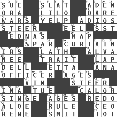 ACROSS 1. Take to court 4. Narrow board 8. Arabian gulf 12. Mouth or opening 13. _ and Stitch 14. Have the gumption 15. Armed conflicts 17. Sharp bark 18. Goodbye (Sp.) 19. Guide 21. Snakelike fish 23. Fast jet (abbr.) 24. Ferber et al. 26. Atlas unit 28. Coast Guard woman 30. Window treatment 34. Big collection agency 37. Thin strip of wood or metal 39. Inventor's middle name 40. Born 41. Distinguishing feature 43. Infant locale 44. Small valley 46. Singer James 47. Santa ___, CA 48. Person of authority 51. Matures 54. Zeal 55. Guide 58. _ tizzy (2 wds.) 61. Third day of the wk. 63. Bodily heat indicating an inflammation 65. Scorch 67. Eras 71. Make new 72. Medicinal plant 73. Court order 74. Corporate head (abbr.) 75. French philosopher Descartes 76. Stricken, poetically 77. Small child DOWN 1. Sty mamas 2. A salt of uric acid 3. Having ears or earlike features 4. Insidious 5. Whopper 6. 100% 7. Drink excessively 8. Increase 9. Raised platform 10. Greek god of love 11. Egg locale 16. Elected reps. 18. Having or resembling wings 20. Hit sharply and swiftly 22. Australian flightless bird 25. Table seasoning 27. Parent Teacher Assoc. 29. More valued for its uncommonness 30. Riviera of "Kiss of the Spider Woman" 31. Silent film actress Nazimova 32. "Terrible" tsar 33. California wine valley 34. Southeast Asian peninsula 35. Coral collection 36. Itself 38. Make lace 42. Labels 45. 54 in ancient Rome 49. Quote 50. Australian flightless bird 52. And so on (abbr.) 53. Singe 56. Voters do this 57. Cowboy competition 58. Astrian river, tributary to the Danube 59. Mediterranean tributary 60. Soon (poet.) 62. Hearing organs 64. Carrot, for example 66. Turn to the right 68. Chewing product 69. Biblical high priest 70. Put into a specified state