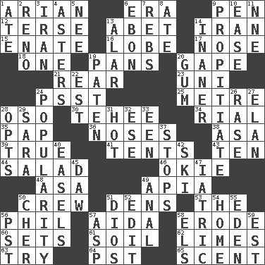 ACROSS 1. Believer in; advocate of (suffix) 6. Period 9. Fenced enclosure 12. Laconic 13. Collude with 14. SW Asia republic 15. Related on the mother's side 16. Ear part 17. Sense of smell 18. Single 19. Baking dishes 20. Stare wonderingly 21. Hitchcock's "____ Window" 23. Single; one (prefix) 24. Inconspicuous attention getter 25. Distance measurement (Brit.) 28. Bear (Spanish) 30. Giggle 34. Monetary unit of Yemen 35. Infant food 36. Olfactory organs 38. White ___ sheet 39. Loyal 41. Portable shelters 43. Nine, plus one 44. Vegetable dish 46. Migrant worker of the '30s 48. White ___ sheet 49. Capital of Western Samoa 50. Group working together 51. Hiding places for outlaws 53. Definite Article 56. Silvers or Donahue 57. Opera by Verdi 58. Eat (away) 60. Puts into a specified state 61. Earth 62. Citrus fruits 63. Attempt 64. Pacific Standard Time (abbr.) 65. Odor DOWN 1. Had dinner 2. Former U.S. Attorney General Janet 3. SW Asia republic 4. Michaelmas daisies 5. Born 6. Inky black, to poets 7. Confederate soldiers (slang) 8. Had dinner 9. Conciliate 10. Comfort 11. Compass dir. 13. Having or resembling wings 14. Sillier 19. Eucharist need 20. Chewing product 22. Eastern Standard Time (abbr.) 24. Teen's desire 26. To erase 27. Style 28. Chooses 29. "Two Mules for Sister ____" 31. Being at a high temperature 32. Compass dir. 33. Car or cant ending 37. Obstructs or blocks passage 40. Artist's stands 42. What Jean-Claude Killy likes to do 45. Simpleton 47. Of or pertaining to medicine 49. Of or related to the anus 50. "Mermaids" star 51. "Vaya con ____" 52. Prepare for publication 54. Dwelling 55. Locale of original sin 56. Pacific Standard Time (abbr.) 57. Viper 58. Raised railways 59. Eastern Standard Time (abbr.)