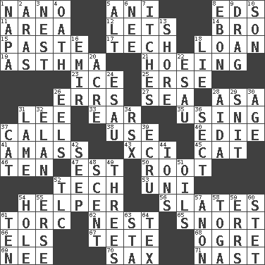 ACROSS 1. Billionth: prefix 5. Cuckoo 8. Begley and Asner 11. Length times width 12. Allows 14. Sis' sibling 15. Thick mixture 17. Technician 18. Grant temporary use of 19. Respiratory problem 21. Weeding 23. Frozen water 25. Celtic language 26. Blunders 27. Ocean 28. White ___ sheet 31. Area sheltered from the wind 33. Hearing organ 35. Exploiting 37. Give a ring to 38. Purpose 40. Singer Brickell 41. Collect or gather 43. One more than ninety 45. Feline 46. Nine, plus one 47. Eastern Standard Time (abbr.) 50. Carrot, for example 52. Technician 53. Corn or form start 54. Aide 56. Chalkboards 61. Torque (variant) 62. Egg locale 65. Derisive sound 66. Raised railways 67. False hair 68. Legendary monster 69. Born 70. Saxophone 71. Political cartoonist Thomas DOWN 1. California wine valley 2. Caspian sea tributary 3. A home for chicks 4. Pledge 5. Keyboard modifier key 6. Born 7. Skin irritations 8. Inky black, to poets 9. To trail on the ground 10. Male offspring 13. Dinah or Pauly 16. Arab leader 18. Falsehood 20. 43,560 square feet 22. He sold his birthright 24. He sold his birthright 26. Snakelike fish 28. Opera by Verdi 29. In a ____ (agitated or irritated) 30. Grow older 31. Unable to walk 32. Style 34. Acura sports coupe 36. Religious group 37. Domesticated feline 39. Shade of tan 42. Ooze 44. Charged atoms 48. Aroma 49. Triplets 51. Lubricates 52. Affectionate concern, for short 54. Opening into or through something 55. Celtic language 57. At once, immediately (arch.) 58. Ancient Roman robe 59. Blunders 60. Proofreading order 61. "___ Little Indians" 63. R.R. building 64. John Ritter's dad
