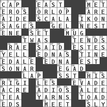 ACROSS 1. Head covering 4. Compass direction 8. Was introduced to 11. Greek god of love 13. Lowest deck of a ship 15. "We ___ not amused" (Victoria) 16. Helper 17. Any of the three canals of the cochlea 18. Picture 19. Gurus 21. Set 22. A home for chicks 23. Compass dir. 24. Arrange properly for use 27. Large cup 29. It was, poetically 30. Watches over 34. Actress Charlotte 36. Stated 39. _____ Park, CO 40. Shout 41. Ferber et al. 43. Prong on a fork 44. Peak District village in England 46. Pulitzer Prize-winning author Ferber 47. Eastern Standard Time (abbr.) 48. Underwater navigation system 49. Mild oath 51. Pet locale 53. Fast jet (abbr.) 54. Part of HMS, perhaps 57. Swiss mountan, "Queen of the Mountains" 60. French article 63. Elude 65. 43,560 square feet 66. Goodbye (Sp.) 69. Toward shelter 70. Afternoon social gathering 71. Tall tales 72. Frog relative 73. Begley and Asner 74. Confront 75. Stealthy DOWN 1. Stop 2. Believer in; advocate of (suffix) 3. Puddle 4. Greek goddess of the dawn 5. Curve 6. Volcanic refuse 7. Lacquered or enameled metalware 8. Cause to be 9. Greek god of love 10. Portable shelter 12. Observe 14. Inside of hand 18. Consumed 20. Compass dir. 25. Comfort 26. Sadhe (variant) 28. Shoshoni 29. Copy Pinocchio 31. Nuclear Threat Initiatives 32. Incision 33. Compass dir. 34. Do over again 35. Actor Alda or Thicke 37. Working for oneself (abbr.) 38. Natives or inhabitants of Denmark 40. Affirmative reply 42. Sinks 45. Epoch 50. Had dinner 52. Romp 54. Saint headwear 55. Standard of perfection 56. Sleazy 57. Pace 58. On the rocks 59. Pate de foie ____ 61. Dutch treat 62. Title for a man of rank and authority 64. Large container 67. Single 68. Fast jet (abbr.)