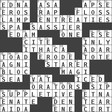 ACROSS 1. Pulitzer Prize-winning author Ferber 5. White ___ sheet 8. Domed church section 12. Greek god of love 13. Reproach for some lapse or misdeed 14. Soft thread for cleaning between teeth 15. Desk light 16. Pleas 19. Health resort 20. More impudent 21. Dutch treat 23. Single 24. Compass dir. 27. Quote 30. In an inward manner 31. New York city 34. The sixth month of the Jewish calendar 35. Frog relative 38. Eat (away) 40. Carryall 41. Hindu god of fire 42. A viewer who gazes fixedly 44. Group of countries in special alliance 45. Wise men 46. Ocean 47. Large container 50. On the rocks 53. Speakers 57. Small drink 59. Supplying deficiencies 63. Inactive volcano in Sicily 64. Related on the mother's side 65. Lair 66. Separate forcefully 67. Opera by Verdi 68. Compass dir. 69. Certainty DOWN 1. Snakelike fish 2. Window treatment 3. Wanderer 4. Viper 5. Type of rug 6. Without 7. Tenement units (abbr.) 8. Keyboard modifier key 9. Luau course 10. Compass dir. 11. Curvy letter 14. Conductor's collection 17. _ de Janeiro 18. Car or cant ending 20. Stricken, poetically 22. Being or containing an acid 24. Inside; within (prefix) 25. Narrow board 26. Jane of fiction 28. Definite Article 29. Hearing organs 30. Of or pertaining to medicine 32. Small bed 33. First man 35. Bar bills 36. Stare at amorously 37. Small Philippine buffalo 39. Period 43. Armor plate that protects the chest 47. Short-tailed, large-bodied rat 48. "We ___ not amused" (Victoria) 49. Make lace 51. First name in cosmetics 52. Middle Eastern gold or silver currency 54. Event that recurs at intervals 55. Baking chamber 56. French philosopher Descartes 58. Role in a play 59. Ocean 60. University (slang) 61. Groovy apt. 62. Parent Teacher Association (abbr.) 63. And so on (abbr.)