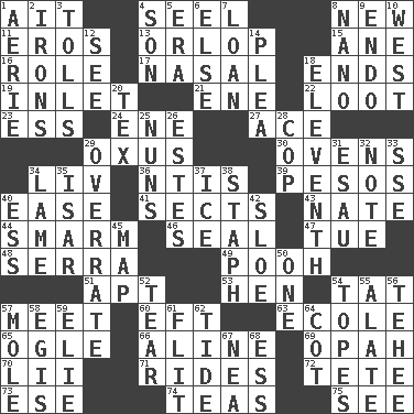 ACROSS 1. Small island 4. Sew up the eyelids of hawks and falcons 8. ___ Haven, CT 11. Greek god of love 13. Fourth or lowest deck 15. A saturated hydrocarbon 16. Hero or heavy, e.g. 17. Rhinal 18. Extremities 19. An arm off of a larger body of water 21. Compass dir. 22. Spoils 23. Curvy letter 24. Compass dir. 27. Adept person 29. The longest river in Central Asia 30. Baking chambers 34. 54 in ancient Rome 36. Nuclear Threat Initiatives 39. Mexican monetary units 40. Comfort 41. Religious groups 43. Nathan's nickname 44. Excessive but superficial compliments 46. Lick closed 47. Third day of the wk. 48. Father Junipero _ 49. "Silly old bear" 51. Fitting 53. Layer 54. Make lace 57. Confront 60. Newt 63. Learning spot: Fr. 65. Stare at amorously 66. Place in a line 69. Brightly colored fish 70. Cards in a Roman deck? 71. Amusement-park features 72. Wig 73. Compass dir. 74. Beverages made from leaves 75. Perceive with the eye DOWN 1. Nest on high 2. Removes the wrinkles 3. For Whom the Bell _____ 4. Manchild 5. Period 6. Otherwise 7. Grant temporary use of 8. Billionth: prefix 9. Inside; within (prefix) 10. Compass direction 12. Perceive with the eye 14. Entreaty 18. Veterans Day date 20. John Ritter's dad 25. Religious women 26. _____ Park, CO 28. Police officer (slang) 29. Make much ado about nothing 31. He sold his birthright 32. Musical sound 33. Compass dir. 34. Unable to walk 35. Astrian river, tributary to the Danube 37. Frozen water 38. Staphylococcus 40. Curvy letter 42. _ gin 45. Atlas unit 50. Single 52. Separate forcefully 54. Drinks excessively 55. Having winglike extensions 56. Giggle 57. Undercover agent 58. Armor plate that protects the chest 59. Writer Wiesel 61. Sudden quick movement 62. Periodic rise and fall of the sea level 64. Small bed 67. Teachers' org. 68. Double-curved letter