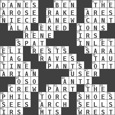 ACROSS 1. Natives or inhabitants of Denmark 6. Benjamin's nick name 9. Definite Article 12. Came up 13. Libertine 14. Ancient Greek god of war 15. Sibling's daughter 16. Afresh 17. Patter 18. According to 19. Made supply last 20. Charged atoms 21. French philosopher Descartes 23. Big collection agency 24. Petty quarrel 25. An arm off of a larger body of water 28. Connecticut Ivy Leaguer 30. Musical pauses 34. "Two Mules for Sister ____" 35. Label 36. All-night dance parties 38. The 19th letter of the Greek alphabet 39. Prong on a fork 41. Leg coverings 43. Baseball player Mel 44. Believer in; advocate of (suffix) 46. One who uses or employs something 48. Bear (Spanish) 49. Opposed to 50. Group working together 51. Component 53. Definite Article 56. Silvers or Donahue 57. Torque (variant) 58. Imelda's hoard 60. Perceives with the eye 61. Bowlike part 62. Makes a sale 63. Big collection agency 64. Mountains (abbr.) 65. Take or capture by force DOWN 1. One of the 12 tribes of Israel 2. Roberta Peters solo 3. Christmas carol 4. Fortification 5. Perceive with the eye 6. Object of repulsion 7. Made supply last 8. ___ Haven, CT 9. Interpreter 10. Coop moms 11. Eastern Standard Time (abbr.) 13. Libertine 14. Oak nuts 19. Keyboard key 20. One more than two 22. Hearing organ 24. Seigniories (variant) 26. Part of Q.E.F. 27. Tense 28. Singer James 29. Den 31. Plant excrement 32. Federal power corp. 33. Elected rep. 37. Check the growth or development of 40. Artist's stands 42. Fast jet (abbr.) 45. At this time 47. One or the other 49. Bowlike part 50. "Mermaids" star 51. Left side of a ship or aircraft 52. Arches 54. Hollow 55. Snakelike fish 56. Air pressure measure (abbr.) 57. Scottish cap 58. Compass dir. 59. Fast jet (abbr.)