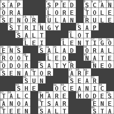 ACROSS 1. Plant excrement 4. Moved rapidly 8. Glance over 12. Mouth or opening 13. Old wives' tales, e.g. 14. Lacquered or enameled metalware 15. Sir (Sp.) 18. ____ Bator 19. General guideline 20. Slender, wiry 22. Plant excrement 23. Table seasoning 24. Car dealer's back yard 25. Luau accessory 26. Small, flat, pigmented spot on the skin 30. Followers of ems 33. First course 36. Taken by mouth 37. Carrot, for example 39. Directed 40. Nathan's nickname 41. Scent 42. Man with strong sexual desires 44. Modern: prefix 45. Legislator 47. Sandy's bark 50. Player for Phoenix 51. Burn superficially 53. A female animal or person 54. Pertaining to the sea 57. Baby powder 59. Female horse 61. Methods 63. Small Philippine buffalo 64. Russian ruler of old 65. Compass dir. 66. Adolescent 67. Table seasoning 68. R.R. building DOWN 1. Mayday 2. Ancient Greek god of war 3. Leg coverings 4. Snaillike creature with no shell 5. Much (prefix) 6. Epoch 7. Lair 8. Ski resort town in Vermont 9. Clever action or accomplishment 10. 100% 11. Born 16. Taken by mouth 17. Cause heat under the collar 21. Nuclear Threat Initiatives 22. Boy, to dad 24. Directed 26. Kenny Rogers chart-topper in '80 27. SW Asia republic 28. Yard entry 29. Butter sub 30. Greek god of love 31. Connecting point 32. Within a short period 34. Having or resembling wings 35. Allow 38. File 13 42. Male offspring 43. Raze (variant) 46. Third day of the wk. 48. 480, 500 or 516 sheets of paper 49. Papal veil 52. Amusement-park features 53. _ gin 54. Taken by mouth 55. Sure thing 56. Penny 57. Make lace 58. One (Scot) 59. Mountains (abbr.) 60. White ___ sheet 62. Ocean