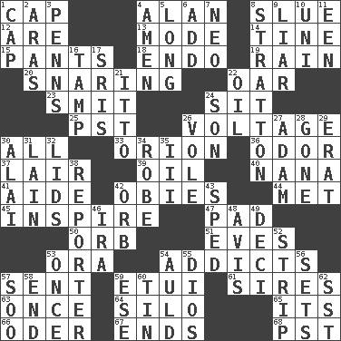 ACROSS 1. Head covering 4. ____ Jay Lerner 8. Change direction abruptly 12. "We ___ not amused" (Victoria) 13. Method 14. Prong on a fork 15. Leg coverings 18. Inside; within (prefix) 19. Precipitation 20. Catching in a trap 22. Boat paddle 23. Stricken, poetically 24. Be seated 25. Pacific Standard Time (abbr.) 26. Electrical Measurement 30. 100% 33. Greek mythologigal hunter 36. Aroma 37. Den 39. Petroleum 40. Nanny 41. Assistant 42. Off-Broadway awards 44. Was introduced to 45. Stimulate to action 47. Writing tablet 50. Globe 51. Nights before holidays 53. Mouth or opening 54. Inveterate users 57. Posted 59. Needle holder 61. Begets 63. Single time 64. Grain storage tower 65. It is 66. Baltic tributary 67. Conclusions 68. Pacific Standard Time (abbr.) DOWN 1. Head covering 2. Ancient river in northeast Turkey 3. Actor Sean's family 4. So be it 5. Yearn 6. Find the sum of 7. Modern: prefix 8. Ski resort town in Vermont 9. One who doesn't tell the truth 10. Corn or form start 11. Car or cant ending 16. Pack (down) 17. Indian titles of respect 21. "Tell ____ the Marines!" 22. Petroleum 24. Male child 26. Short-tailed, large-bodied rat 27. First man 28. Went 29. Part of Q.E.F. 30. Jai _ 31. (Had) reclined 32. Hats (slang) 34. Loose flowing garment 35. One more than two 38. News announcer 42. Globe 43. Hurried 46. Lyricist Gershwin 48. Advice 49. Tenth: prefix 52. Long narrow piece of something 53. Single time 54. Old (Scot.) 55. "Vaya con ____" 56. Arranges properly for use 57. "Barney Miller" actor Jack 58. Conclude 59. Compass dir. 60. Metal container 62. Fast jet (abbr.)