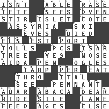 ACROSS 1. Is not 5. Competent 9. Raze (variant) 13. Wig 14. Perceives with the eye 15. Baking chamber 16. Tumult 17. Small island 18. ____ d'Azur (French Riviera) 19. Nineveh was its capital 21. What Jean-Claude Killy likes to do 22. Nights before holidays 23. Passed on 24. Raised railways 27. Eastern Standard Time (abbr.) 28. Sweet dark-red dessert wine 29. For Whom the Bell _____ 31. Personal Computers (abbr.) 32. Astrian river, tributary to the Danube 36. Family _ (genealogy) 37. Affirmative reply 38. Sense of smell 39. Opera by Verdi 40. Writing instrument 41. Stares at amorously 42. Canvas cover 44. For each 46. Erode 47. Through, poetically 48. Slanted text style (abbr.) 50. Perceive with the eye 51. Pre-World Series prize 54. The sixth month of the Jewish calendar 56. Phillipine bananalike plant 58. Letter starter 60. Travel on or in a vehicle 61. Filth; sediment 62. Unable to walk 63. Nourish 64. Grows older 65. Otherwise DOWN 1. It is 2. Bristle 3. Nuclear Threat Initiatives 4. Laconic 5. Aid 6. Actor Lugosi 7. Area sheltered from the wind 8. Eastern Standard Time (abbr.) 9. Shooting up abruptly 10. Prevent the occurrence of 11. Put into a specified state 12. Compass dir. 17. Angers 20. Jacques Cousteau's middle name 21. Title for a knight 23. Two (Sp.) 24. Singer James 25. Australian parrot (variant) 26. Downhill vehicle 28. Personal Computers (abbr.) 30. Tough but pliablecoriaceous 31. Animal enclosure 33. Not divided or shared with others 34. At sea 35. Respite 37. Slangy assent 40. Adept person 41. NW Algerian seaport 43. "We ___ not amused" (Victoria) 44. Parts 45. Inactive volcano in Sicily 47. Sadhe (variant) 49. Dipping utensil 51. Light colored 52. Actress Patricia 53. Scottish caps 54. Sandy's bark 55. Pass on 56. White ___ sheet 57. Large 59. Portuguese money of account (variant)