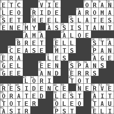 ACROSS 1. And so on (abbr.) 4. Compete 7. Northwest Algerian city 11. Lion 12. Travel on an animal 13. Scent 14. Arrange properly for use 15. The bottom of a shoe or boot 16. Chalkboards 17. Foe 19. Helper 21. Nanny (var.) 23. _ vera 24. Cy Young winner Saberhagen 25. Pipe bend 26. R.R. building 29. Desist 30. Mountains (abbr.) 31. Baking dish 32. Epoch 33. French article 34. Mature 35. Set 36. Car or cant ending 37. Connects, as a bridge 40. Turn to the right 41. Plus 42. Blunders 43. Australian parrot (variant) 45. Small child 46. Home 51. Impudent aggressiveness 55. Declaimed 56. For fear that 58. Small island 59. Carrier 60. Margarine 61. The 19th letter of the Greek alphabet 62. SW Saudi Arabia district 63. Pacific Standard Time (abbr.) 64. Connecticut Ivy Leaguer DOWN 1. Otherwise 2. Adolescent 3. ____ d'Azur (French Riviera) 4. Compete 5. The content of cognition 6. Snakelike fish 7. Declaim 8. Roll call or roster of names 9. So be it 10. Political cartoonist Thomas 12. Poems 13. In addition 16. Beverly of Met fame 18. Hindu Mythology: god of death 20. Table seasonings 22. Had dinner 24. Calif. Air Force Base 25. Make improvements or corrections to 26. Connects, as a bridge 27. Labels 28. A saturated hydrocarbon 29. Algonquian 32. Ovum 33. Soviet premier 1918-24 36. Having ears or earlike features 37. Put into a specified state 38. Right away 39. Johnson of "Laugh-In" 43. 61 cubic inches 44. River in Europe 46. Round or rotation of duties 47. Greek god of love 48. Suttee (variant) 49. Hoof sound 50. Snakelike fish 52. Pace 53. Small bottle 54. Needle holder 57. Put into a specified state