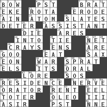ACROSS 1. Arrow shooter 4. Pacific Standard Time (abbr.) 7. Naughty child 11. Supplement with great effort 12. Round or rotation of duties 13. Eat (away) 14. The 18th letter of the Arabic alphabet 15. Tiny particle 16. Chalkboards 17. Prevent from occurring 19. Helper 21. Expire 23. Ancient Greek god of war 24. To the inside or interior of 25. Standoff 26. Fish or hair follower 29. Trading vessels 30. Followers of ems 31. "We ___ not amused" (Victoria) 32. Thick or sticky substance 33. Erode 34. Saxophone 35. A really long time 36. Armed conflict 37. Small fatty European fish 40. Raised railways 41. It is 42. Relating to the mouth 43. Old wives' tales, e.g. 45. Distress signal 46. Dwelling 51. Impudent aggressiveness 55. Speaker 56. Monthly bill 58. Snakelike fish 59. Carrier 60. Butter sub 61. One more than two 62. SW Saudi Arabia district 63. Pacific Standard Time (abbr.) 64. Compass dir. DOWN 1. Necklace unit 2. Migrant worker of the '30s 3. Gone 4. Plant holder 5. Portico 6. Scottish caps 7. Naughty children 8. Roll call or roster of names 9. An important port of Yemen 10. Trial 12. Noteworthy scarcity 13. Otherwise 16. Fathers 18. Pulitzer Prize-winning author Ferber 20. Inhabitant of Heaven 22. Greek goddess of the dawn 24. Metal shackles 25. Separates forcefully 26. Relating to the nose 27. Part of Q.E.F. 28. John Ritter's dad 29. Calm and collected 32. Unit of force equal to gravity 33. Ingested 36. One who wires 37. Distress signal 38. Right away 39. To erase 43. 61 cubic inches 44. Scent 46. Roll call or roster of names 47. Greek god of love 48. Suttee (variant) 49. Riding implement 50. Snakelike fish 52. It's straight from the horse's mouth 53. Distinctive style or manner 54. Writer Wiesel 57. Fish or hair follower