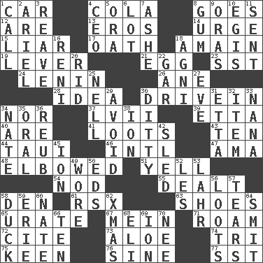 ACROSS 1. Automobile 4. Root beer relative 8. Leaves 12. "We ___ not amused" (Victoria) 13. Greek god of love 14. Goad 15. One who doesn't tell the truth 17. Pledge 18. With great haste 19. Crowbar 21. Ovum 23. Fast jet (abbr.) 24. Soviet premier 1918-24 26. One (Scot) 28. The main thing one is thinking about 30. Popular '50s hangout 34. Or not 37. 57 in ancient Rome 39. Singer James 40. "We ___ not amused" (Victoria) 41. Plunders 43. Nine, plus one 44. "Change" in Tahitian 46. International (abbr.) 47. Nursemaid (var.) 48. Turned at an angle; bent 51. Shout 54. Allow head to fall sleepily 55. Started a card game 58. Lair 61. Acura sports coupe 63. Imelda's hoard 65. A salt of uric acid 67. Count _ (2 wds.) 71. Wander aimlessly 72. Quote 73. Medicinal plant 74. Three (prefix) 75. Peachy ____! 76. Trig term 77. Fast jet (abbr.) DOWN 1. Give a ring to 2. Satellite of Uranus 3. Break or tear apart 4. Corporate head (abbr.) 5. Mouth or opening 6. Car dealer's back yard 7. American tennis player Robert 8. Chewing product 9. Mouths or openings 10. Armor plate that protects the chest 11. Transmitted 16. Painter Guido (1575-1642) 18. Hindu god of fire 20. To free from 22. Slender fish 25. 1994 drama film starring Jodie Foster 27. First lady 29. Keep away from 30. Short, simple song 31. Singer James 32. Detail 33. Grandmother 34. Nathan's nickname 35. Taken by mouth 36. Reuben's nickname 38. Electrically charged atom 42. Downhill vehicle 45. Electrically charged atom 49. Had on 50. Begley and Asner 52. French article 53. Cowardly lion portrayer 56. Plunders 57. Lacerates 58. Evade 59. One of the Great Lakes 60. Nathan's nickname 62. Dec. holiday 64. Stricken, poetically 66. Nine, plus one 68. Biblical high priest 69. Electrically charged atom 70. Born