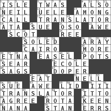 ACROSS 1. Capri or Wright 5. It was, poetically 9. In addition 13. Famous astronaut Armstrong 14. Ubangi River tributary 15. Amid 16. Give a ring to 17. Interpreter 19. "One Day ___ Time" 20. Institute legal proceedings 21. Bear (Spanish) 22. Deep reverence 23. Native of Scotland 25. To sift 26. Having a sole or soles 30. Like ___ of sunshine 34. Capital of Egypt 35. Greater amount 36. Inactive volcano in Sicily 39. Artist's stand 42. Cooking vessels 43. Burn superficially 44. Learning spot: Fr. 46. Settles 47. Drug addict 48. Ingest 51. 1994 drama film starring Jodie Foster 54. Institute legal proceedings 57. Deep reverence 58. Flaplike covering 60. One more than two 62. Interpreter 65. "Tell ____ the Marines!" 66. Match 67. Round or rotation of duties 68. Peachy ____! 69. Nanny 70. Comedian Laurel of Laurel & Hardy 71. Blunders DOWN 1. South American Indian 2. Theater features 3. Pale purple color 4. Pipe bend 5. Ballerina skirt 6. Past tense of be (plural) 7. Wing 8. Sir (Sp.) 9. Nanny (var.) 10. Globular water bottle used in Asia 11. Overwhelm 12. Legendary monster 15. Medicinal plant 18. Compass dir. 20. Portico 24. Motion picture awards 27. Falsehood 28. Epoch 29. Administered medicine 30. Electrical Unit 31. Friend of Pooh 32. Tate display 33. Consenting reply 36. Curvy letter 37. Beverage made from leaves 38. Tired old horse 40. Environmental prefix 41. Trim (branches) 45. Grant temporary use of 48. Comfort 49. Leather borer 50. Pulls apart 52. 61 cubic inches 53. 61 cubic inches 54. Comedian Laurel of Laurel & Hardy 55. Capital and largest city of Mongolia 56. Merit 58. Globular water bottle used in Asia 59. SW Asia republic 61. Charged atoms 63. Teachers' org. 64. Small child 65. Mamie's husband