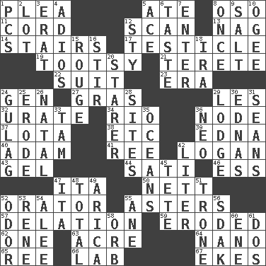 ACROSS 1. Entreaty 5. Had dinner 8. Bear (Spanish) 11. Drawstring 12. Examine hastily 13. Tired old horse 14. Flight of steps 17. A testis 19. Tootsie (variant) 21. Cylindrical with tapered ends 22. Set or collection 23. Epoch 24. Commissioned military rank (abbr.) 27. Pate de foie ____ 29. French article 32. A salt of uric acid 34. _ de Janeiro 36. Thickened enlargement 37. Globular water bottle used in Asia 38. And so on (abbr.) 39. Pulitzer Prize-winning author Ferber 40. First man 41. Portuguese money of account (variant) 42. Utah city north of Ogden 43. Set 44. Suttee (variant) 46. Double-curved letter 47. Call ___ day 50. Remaining after all deductions 52. Speaker 55. Michaelmas daisies 57. Conveyance 59. Eaten away 62. Single 63. 43,560 square feet 64. Billionth: prefix 65. To riddle 66. Experiment locale 67. Makes supply last DOWN 1. Personal Computers (abbr.) 2. Car dealer's back yard 3. Part of Q.E.F. 4. Goodbye (Sp.) 5. Adept person 6. Clothes sense 7. Keyboard key 8. At one time in the past 9. Table seasoning 10. Double curve, resembling the letter S 12. Filthy place 15. Makeup applied to the cheeks 16. Use a spoon 18. Lyricist Gershwin 20. A viewer who gazes fixedly 24. POW camp 25. Eat (away) 26. Brizilian seaport 28. Locates 29. Inn 30. Ferber et al. 31. Seines 33. Scottish cap 35. Seas 36. Modern: prefix 42. 61 cubic inches 45. False hair 47. Call ___ day 48. Add up to 49. N. Chile seaport 51. Marketplace scale 52. Aroma 53. French philosopher Descartes 54. Toward shelter 55. A saturated hydrocarbon 56. Neighbor of Neb. 58. Globe 60. Compass dir. 61. Two (Sp.)