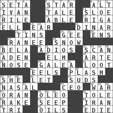 ACROSS 1. Stalk of a moss capsule 5. Play the lead 9. The first octave above the treble staff 12. "Terrible" tsar 13. Lie 14. _ gin 15. Cause heat under the collar 16. Competent 17. Capital of Latvia 18. Pipe bend 19. Hearing organ 21. Middle Eastern gold or silver currency 22. Metal containers 24. Turn to the right 26. Followers of ems 27. Indian princess (variant) 28. Overwhelm 29. Actor Lugosi 30. Goodbye (Sp.) 32. Examine hastily 36. Arabian gulf 37. Shade tree 38. Johnson of "Laugh-In" 39. Olfactory organ 40. An organ shaped like a helmet 42. Spoils 43. Snakelike fish 44. Suffix with ecto or cyto 46. A female animal or person 49. Allow 50. Soap bubbles 51. Rhinal 53. Corporate head (abbr.) 54. Armed conflict 57. Northwest Algerian city 58. Margarine 61. Lacquered or enameled metalware 62. Immoral or dissolute person 63. Ooze 64. SW Asia republic 65. Three (prefix) 66. Lubricates 67. Singer Brickell DOWN 1. Title for a man of rank and authority 2. Tending to cause great harm 3. Baron Munchausen's specialties 4. One (Scot) 5. Play the lead 6. Bar bill 7. Everything 8. To sift 9. Place in a line 10. Utah city north of Ogden 11. Separates forcefully 14. _ Lanka 19. Compass dir. 20. Toward the sea 21. Morning condensation 23. Silly 24. Dwarf 25. Greek goddess of the dawn 27. Do over again 28. Beverly of Met fame 29. Bar 31. Started a card game 32. First course 33. What you're doing now 34. Tiny particle 35. Fish or hair follower 40. Unit of force equal to gravity 41. Domed church section 43. Pipe bend 45. Nilotic language 46. Derisive sound 47. Ethiopian city, capital of Harari 48. 1973 Nobel Price Winner (Physics) Leo 52. One (Scot) 53. 911 reaches them 55. Jai _ 56. French philosopher Descartes 58. Bear (Spanish) 59. Flowery wreath 60. Snakelike fish 61. Make a knot